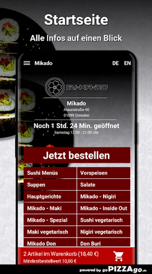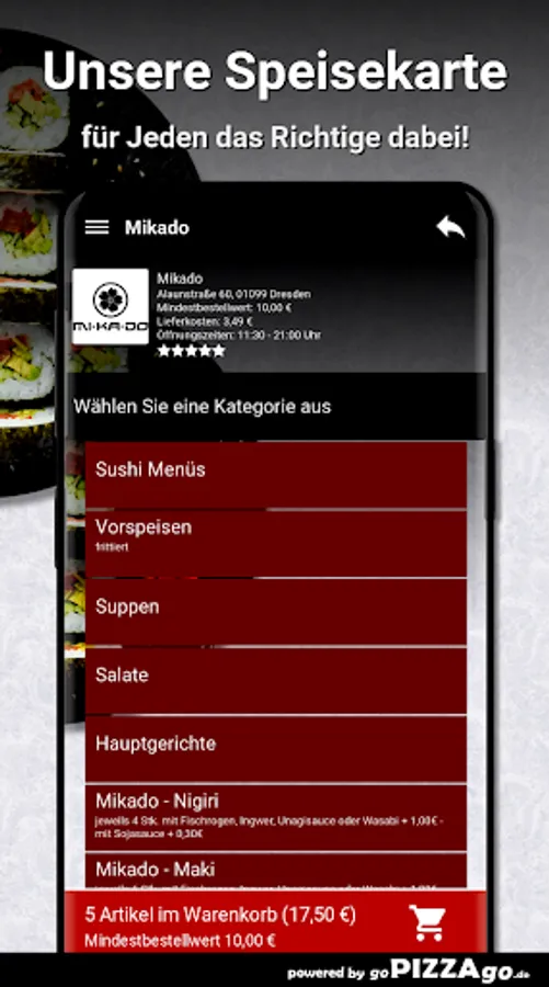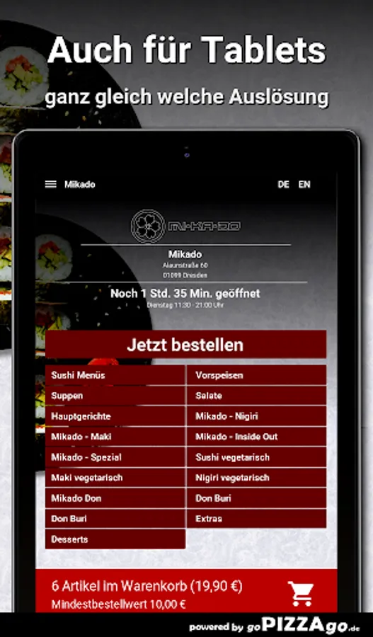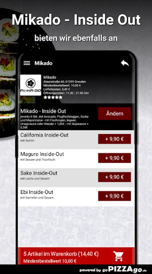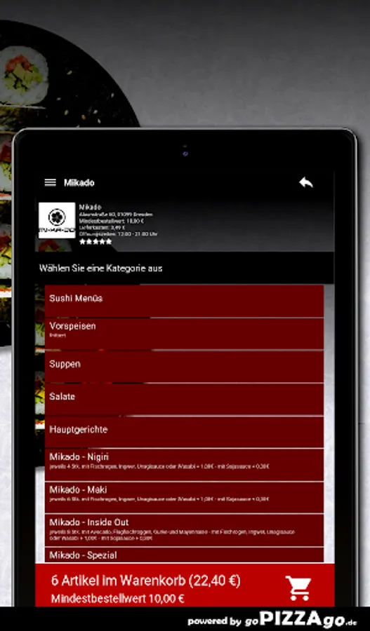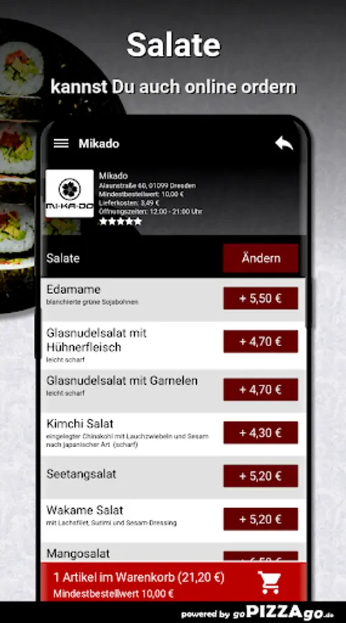 You can order freshly prepared food online from the Mikado delivery service (01099 Dresden) easy. In our online menu you will of course find 152 dishes and drinks such as fried udon noodles with tofu for € 8.50 or peanut sauce with prawns for € 14.90.Mikado Top-7Our opening times