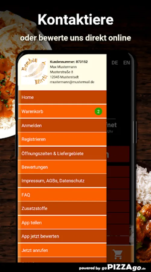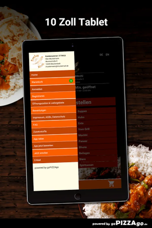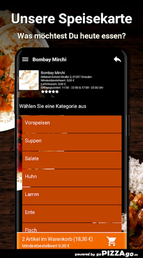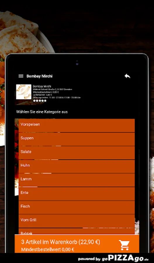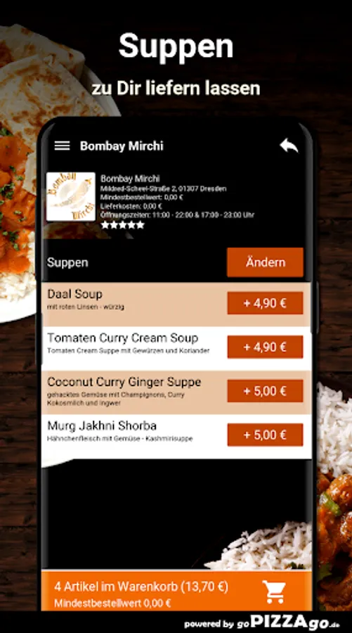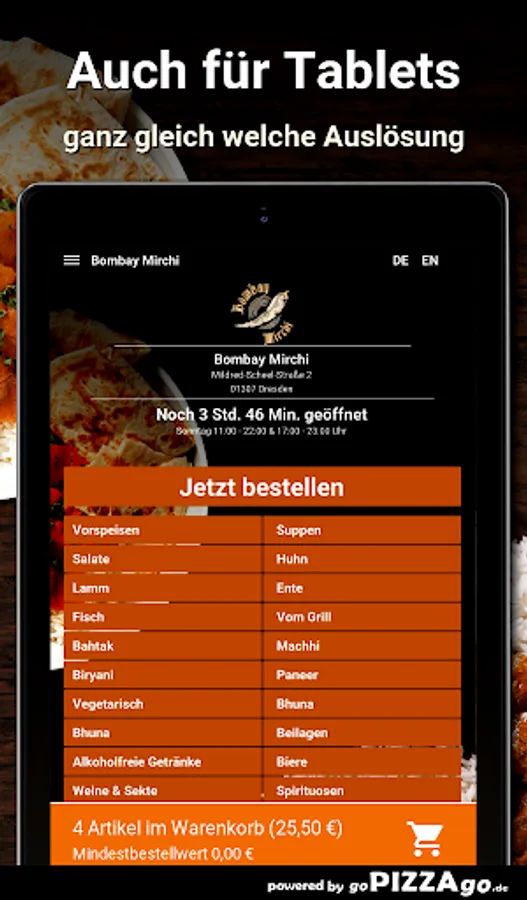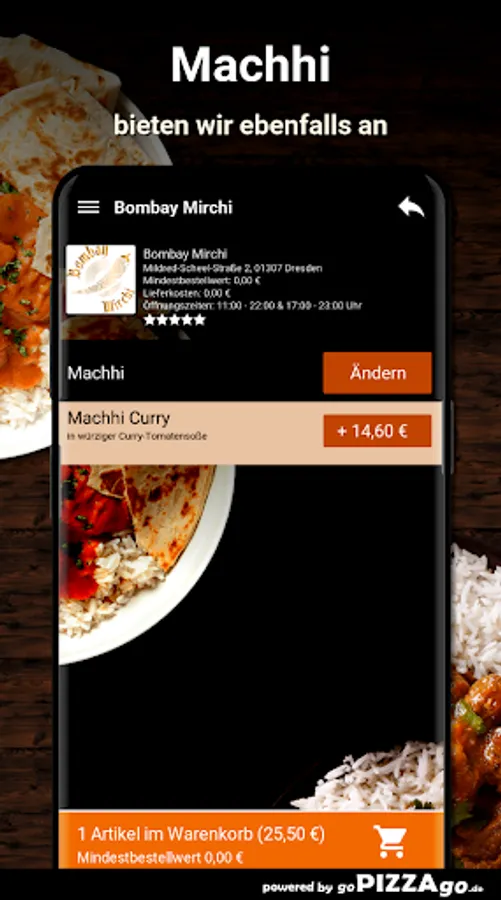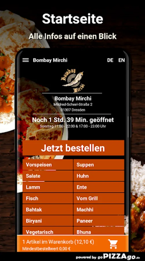 The delivery service brings you Lamb Biryani, Lamb Mango at a price of € 13.90, CHicken Madras is delivered at a price of € 12.90, Lambd Jalfrezi is available online for only € 14.90, Prawn Masala is delivered to you For € 14.60, you can get Paneer Butter Masala delivered to your place of residence for € 12.90. Lamb Palak is available for 14.60 euros and Malai Chicken Tikka for an amazing 14.90 euros.