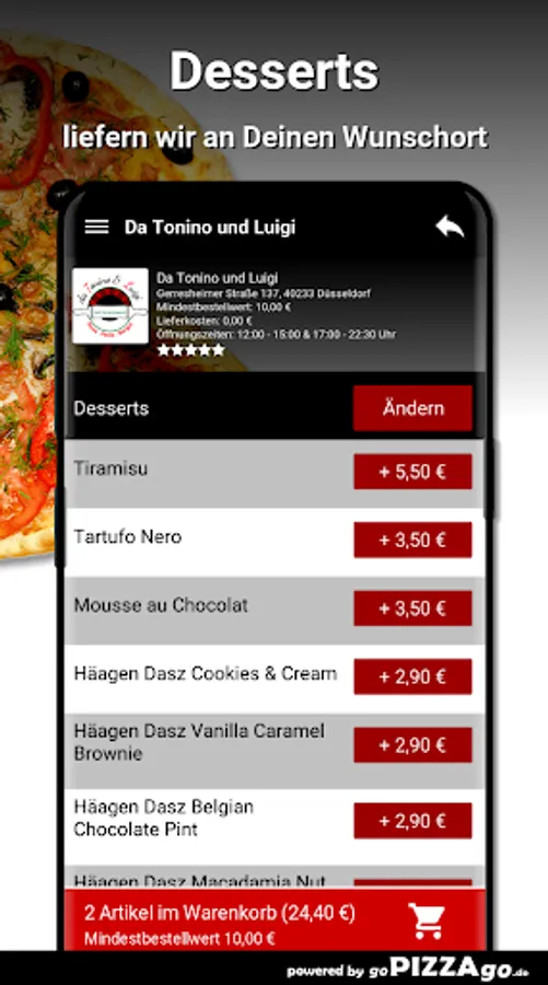 You can order many delicious dishes in our online shop with our easy online pizza delivery service. Our menu has more than 114 dishes, including Pizza Salmone, Green Salad, Garganelli de la Chef, Garganelli Arrabiata, Spaghetti Aglio Olio, Lasagna, Pizza Parma and Tortelloni ai Porcini for €13.50. After the meal we suggest a dessert: Mousse au Chocolat, Häagen Dasz Cookies & Cream, Häagen Dasz Belgian Chocolate Pint, Häagen Dasz Strawberry Cheesecake Also order soft drinks such as still water, Fanta, apple spritzer, Coca-Cola Zero ordered ?When will Da Tonino and Luigi deliver?