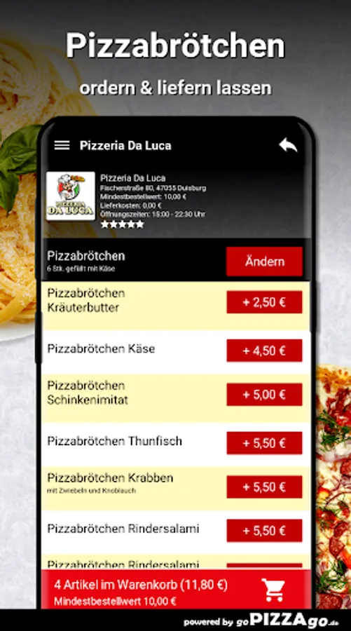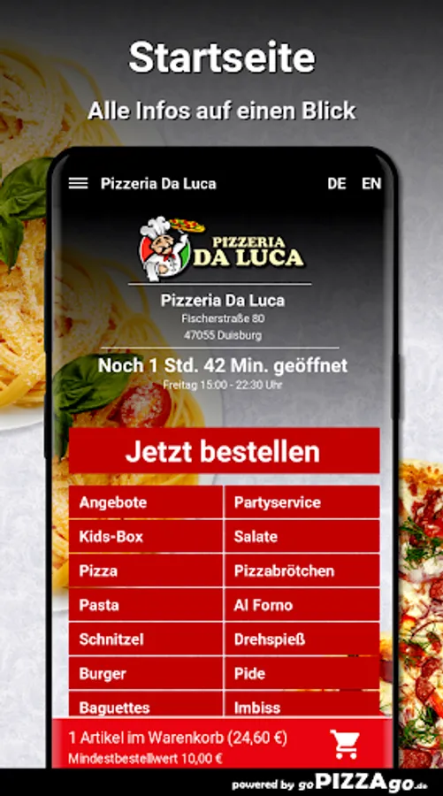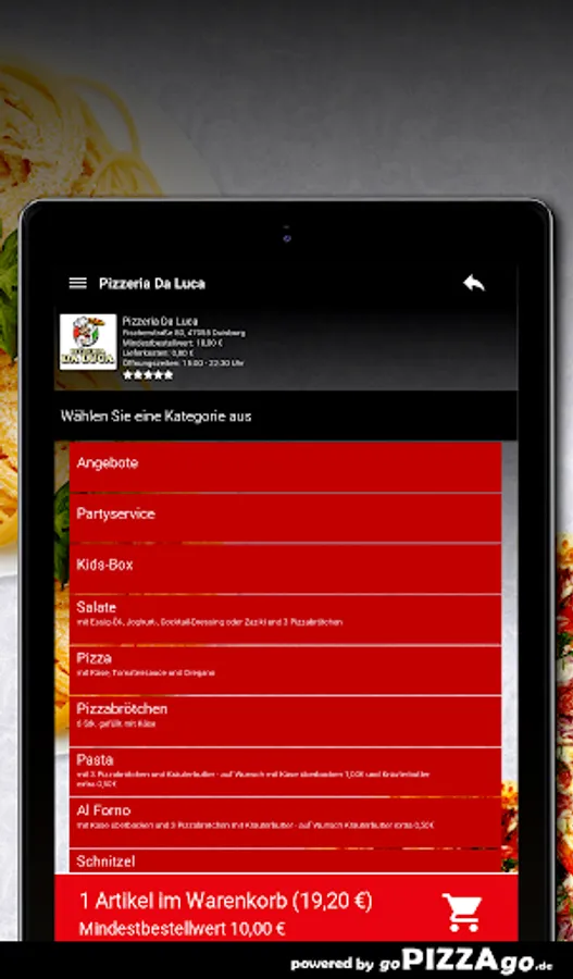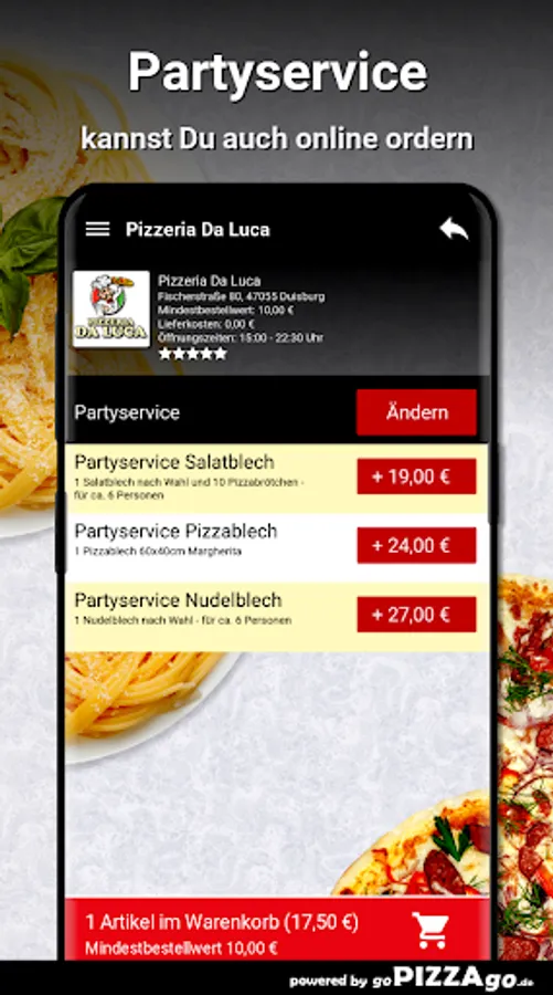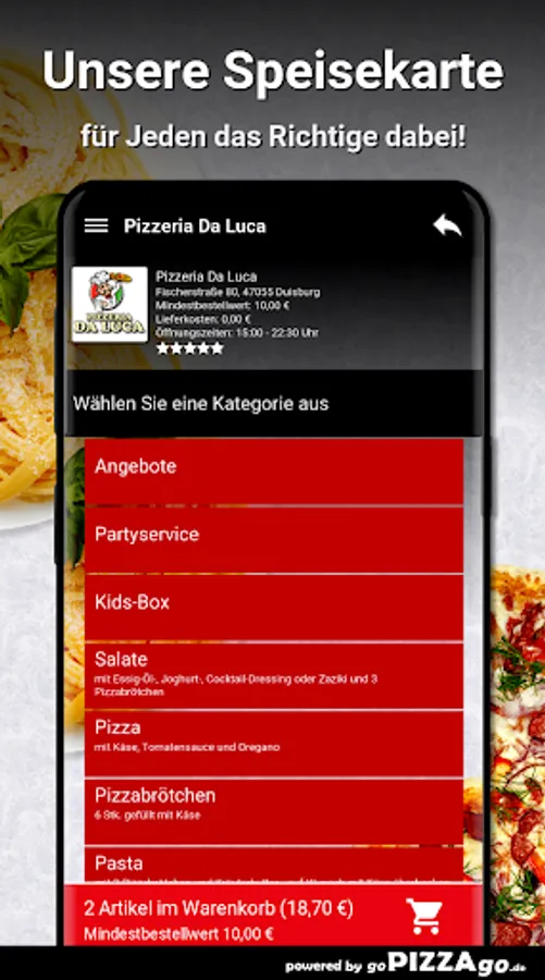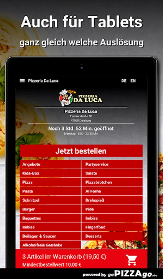 Pizzeria Da Luca - your delivery service in DuisburgWith us you can order burgers, pasta, party service, pizza, pide, baguettes, pizza rolls, Al Forno here and have them delivered.