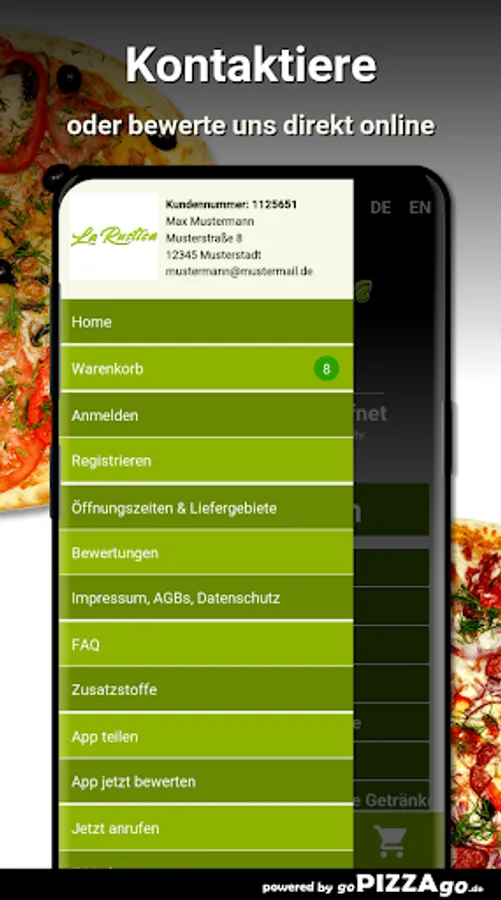 Let the La Rustica delivery service seduce you today with the Mediterranean way of life in Italy! We also have a very good range of delicacies from Italy with 110 delicious dishes. Pizza Capri is available for €6.00 - €10.50. Spaghetti alla Vongole al Forno will be delivered to you for €8.50, you can order an aromatic, tasty spinach pizza for €5.50-10.50, and the delivery service will bring you direct pizza with tagliatelle Marco Pollo for €9.00 to you, cannelloni with spinach filling al forno, spaghetti romantica for a fabulous 7 € and the most delicious macaroni alla Maria al Forno can be ordered for 7.00 €.