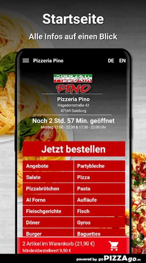 Pizzeria Pino - your delivery service in Duisburg At Pizzeria Pino you can order pizza rolls, Al Forno, salads, kebab, pasta and burgers online.