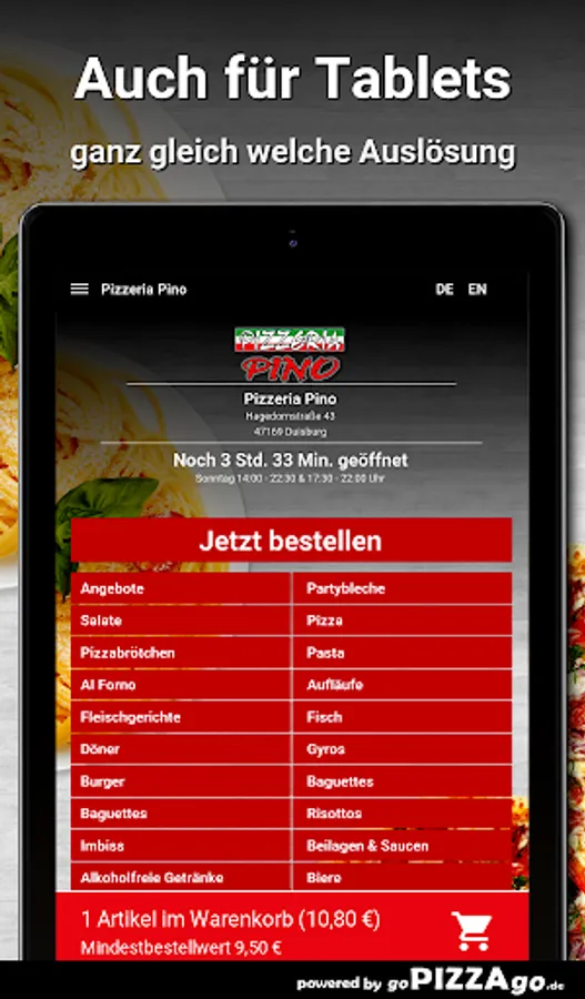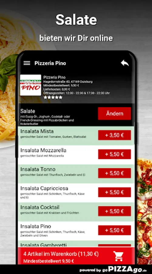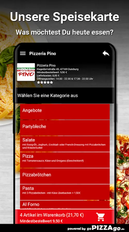 Dishes that are deliciously prepared and delivered hot can be ordered quickly and easily from our pizza service and delivered. Our online menu has more than 282 feasts like Insalata Pollo for € 6.00 or Schnitzel Gorgonzola for € 9.50. Also order drinks: Red Bull, Coca-Cola, Sprite, Fanta.Pizzeria Pino Top-7 When we deliver your feasts