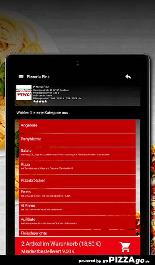 You can get tasty aromatic pizza Quattro Stagioni for 5.50-9.00 € wherever you want, Pizza Spinaci. The finest Pizza Patata is delivered at a price of € 5.00-8, Pizza Frutti di Mare is available here online for just € 5.50 to € 9 for delivery, Tortellini Spinaci to your front door, Spaghetti Napoli is available to you at Pizzeria Pino for Only 5.50 €, you can order delicious spaghetti Pino al Forno from Pizzeria Pino for just 8 € and you can order really good Pizza Capricciosa for 5.50-9.00 €.