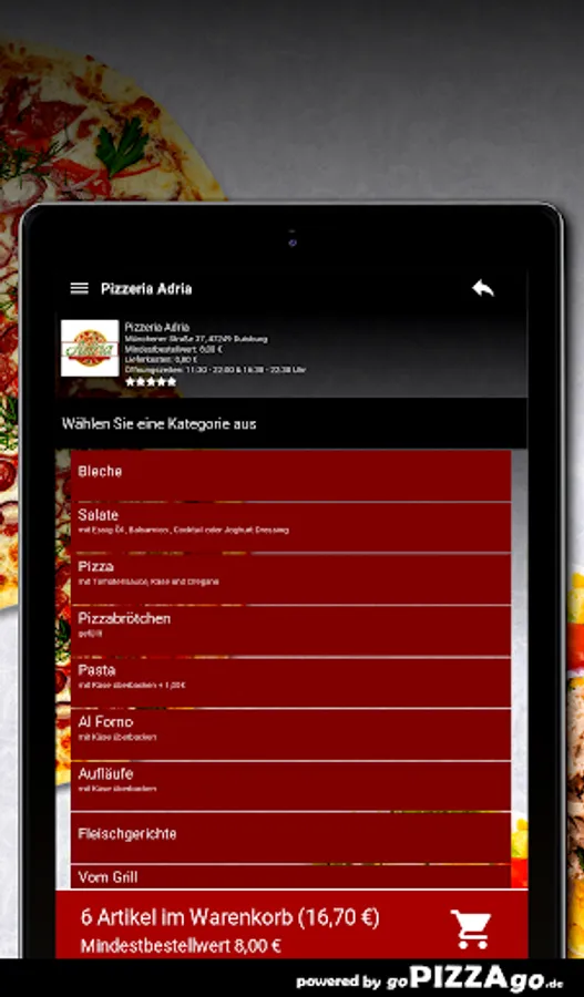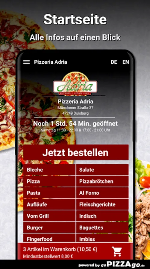 The freshest ingredients, unforgettable flavors - order delicious Italian food at Pizzeria Adria online127 You can order typical Italian meals safely and easily here at Pizzeria Adria. Really good Gnocchi ai Formaggi, aromatic tasty Tortellini Napoli are available for 6.50 €, Pizza Texas to the delivery location of your choice, Pizza Rustica (5.00-14.00 €), Lasagne, Pizza Hollandaise Spinaci are delivered to you for 4.00 -16.00 €, Pizza Granchio di Mare, Pizza Spinaci.