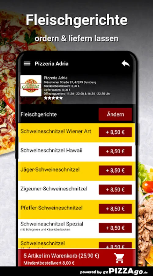 Order wholesome schnitzel dishes online at Pizzeria Adria 16 tempting schnitzel offers you Pizzeria Adria online. Let the crispy and hot pork schnitzel Gorgonzola sauce bring to the surface. Pork schnitzel special, good turkey schnitzel Hawaii 8.50 €, turkey schnitzel Viennese style brings you the delivery service at a price of 8.50 euros.