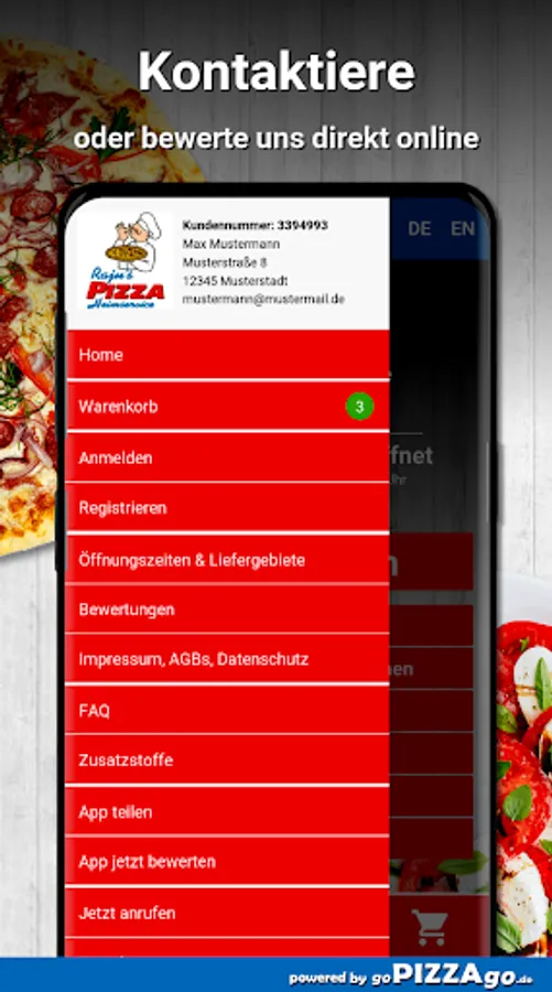 Are you hungry and in the mood for pizzas at Rajus Pizza Heimservice in Durmersheim? Have you ever ordered really good pizza online from Rajus Pizza Heimservice and had it delivered? Pizza Roma with oregano, tomato sauce and cheese, Pizza Milano to bring, crispy baked and topped pizza Caribbean delivered to your home for 9.00-30 €, Pizza Don Peppone, Pizza Primavera straight to you, crispy baked and topped pizza salami Funghi with mushrooms or Pizza Boston are available for € 9-30.