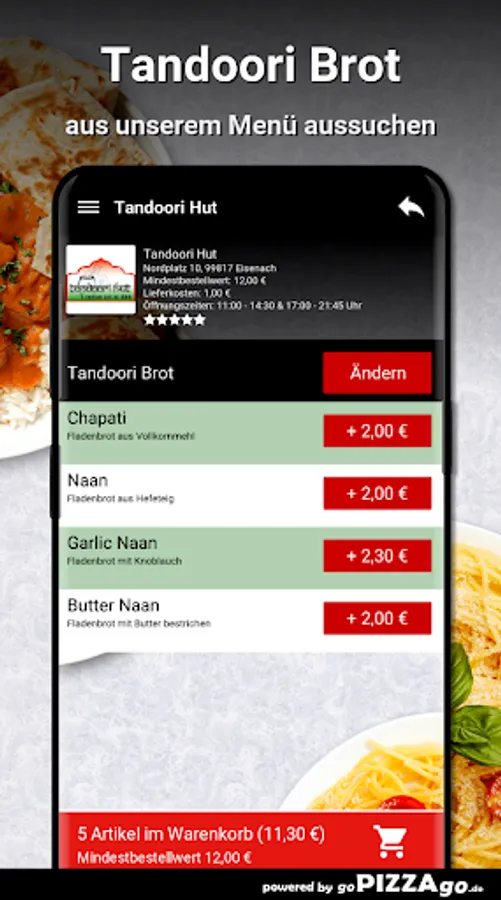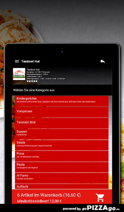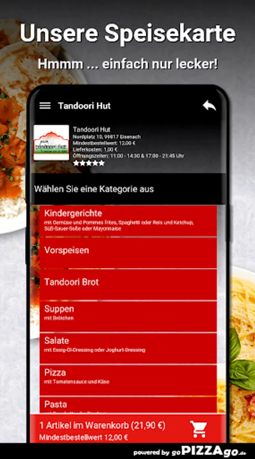 Cravings for Indian? .. of course no problem at Tandoori Hut in Eisenach.Totally delicious (43 in number) Indian feasts you can safely order here. Beef Korma is brought to your doorstep for € 13, Palak Paneer can be delivered to your home for € 10.50. Vegetable samosa is available for € 3.90.