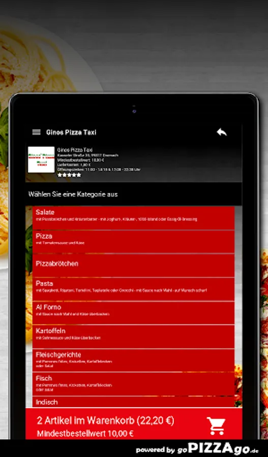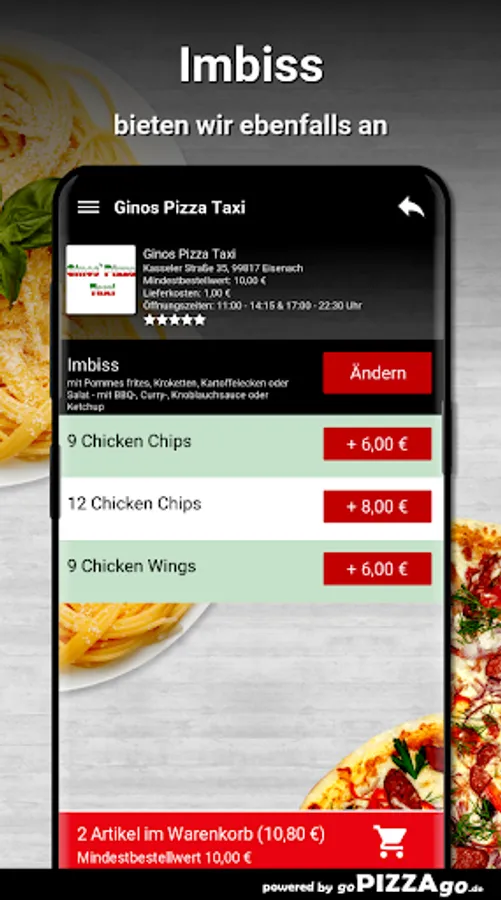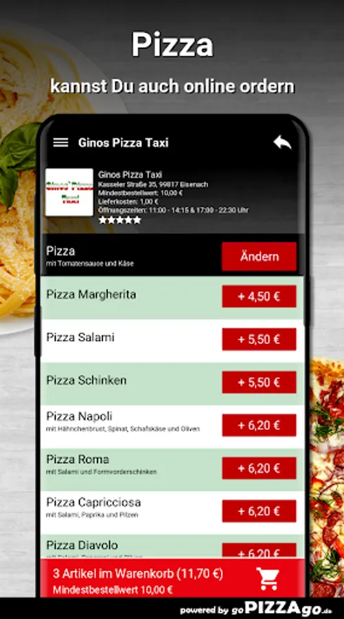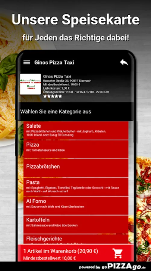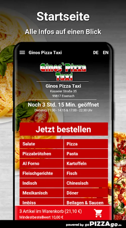Welcome to Ginos Pizza Taxi in Eisenach! At Ginos Pizza Taxi you can order fish, meat dishes, Chinese, pasta .. totally freshly prepared.