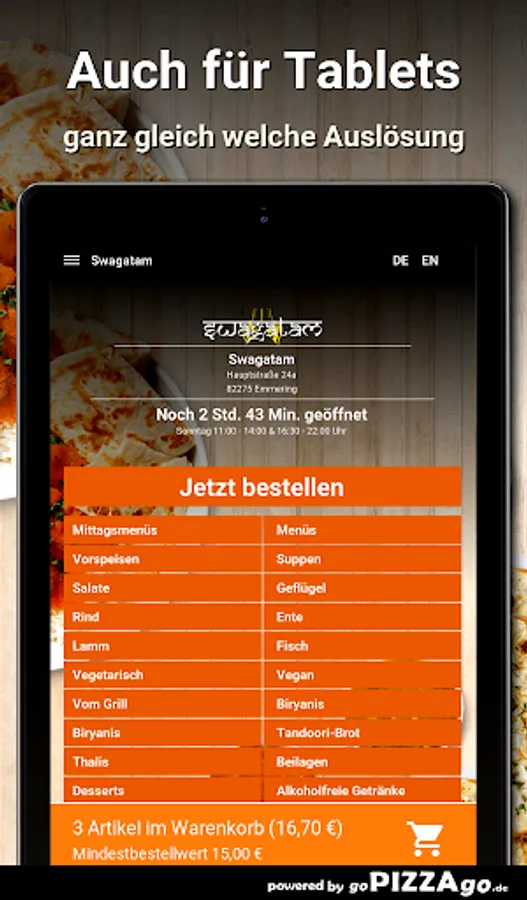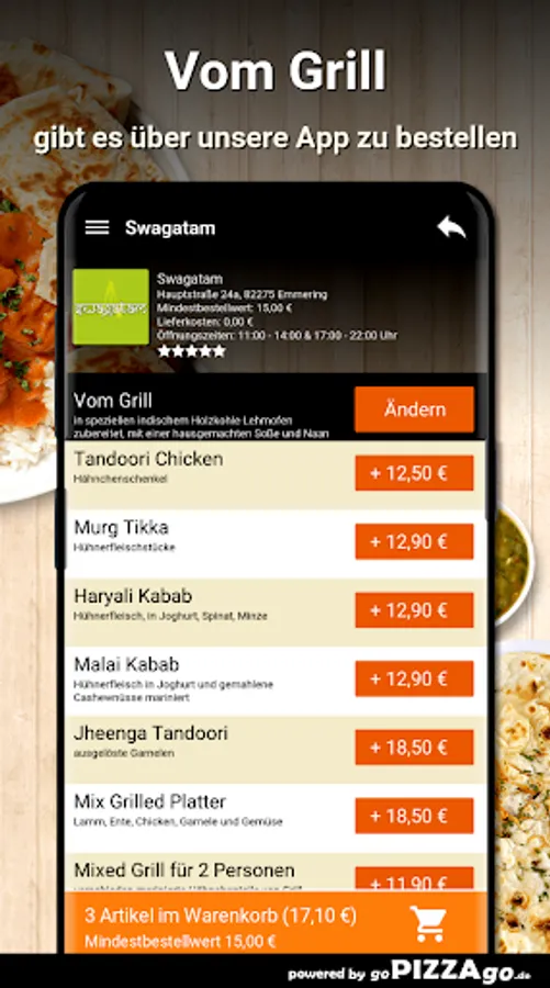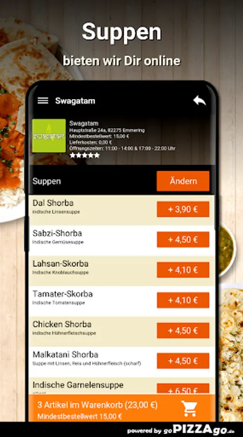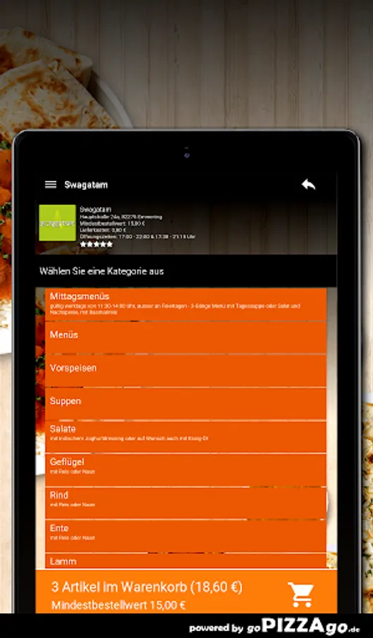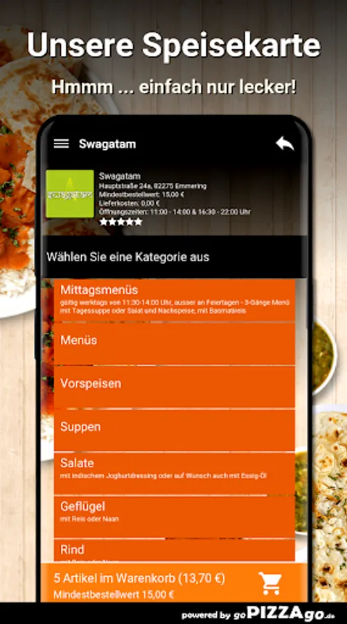 You can order a variety of fine meals quickly and securely online from our delivery service. We offer 179 dishes and drinks. Don't feel like cooking for lunch? Then simply order Duck Jalfrezi (€ 10.50), surprise menu for 2 people (€ 26.00), Jaipuri Thali (€ 9.90), Chicken Korma (€ 8.50), Jheenga Khumb Wala (€ 12, 50), Bhindi Masala (€ 9.90). (these dishes cannot be ordered at all times) What do you like to order? When do we deliver?