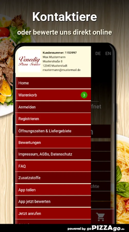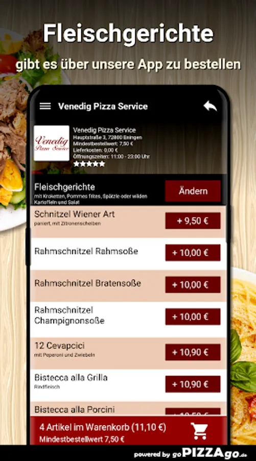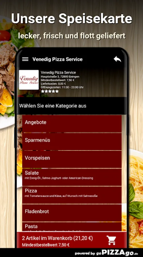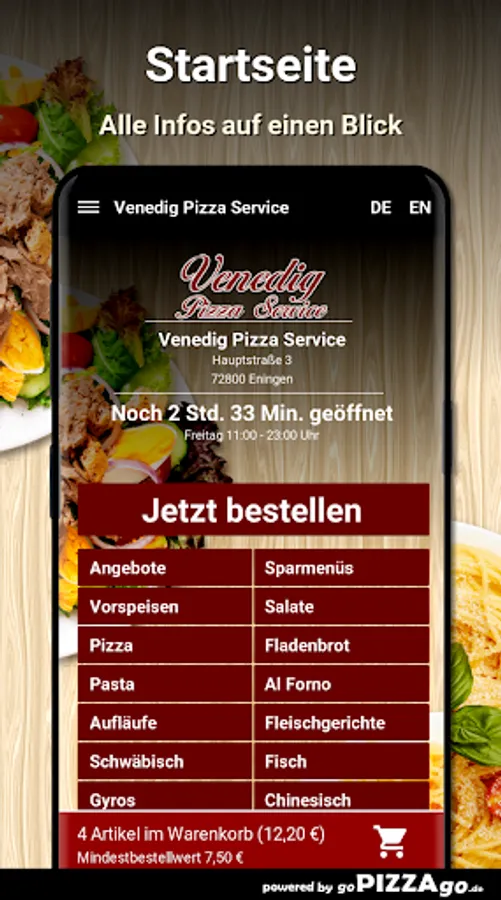 Antipasti, pasta and pizzas: Italian culinary art offers you many delicacies with Venice Pizza Service81 Italian delicacies are also available online for you with our delivery service. Pizza Margherita can be delivered to you from 7.00-19.00 €.