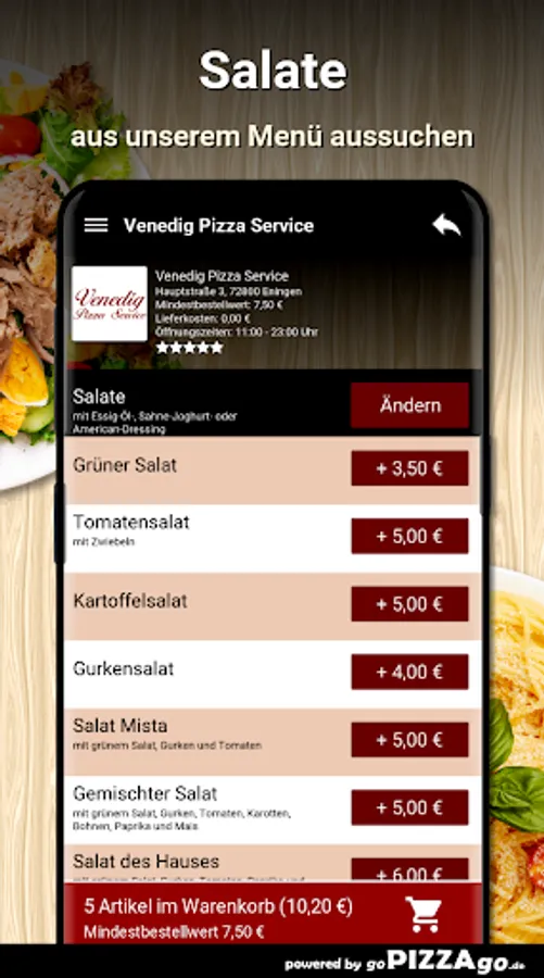 Have crunchy salads in Eningen from Pizza Home Service Venice Pizza Service The salads at Venice Pizza Service are a taste experience. We offer you 15 salads. Freshly prepared cucumber salad straight to you, tuna salad is available online for just € 6.00, the delivery service brings you tomato salad for € 5.00.
