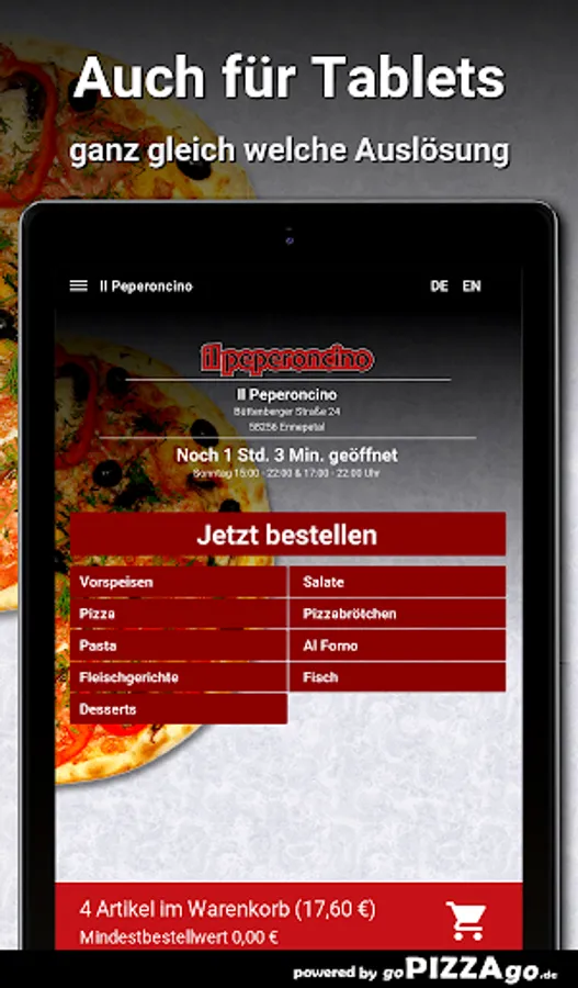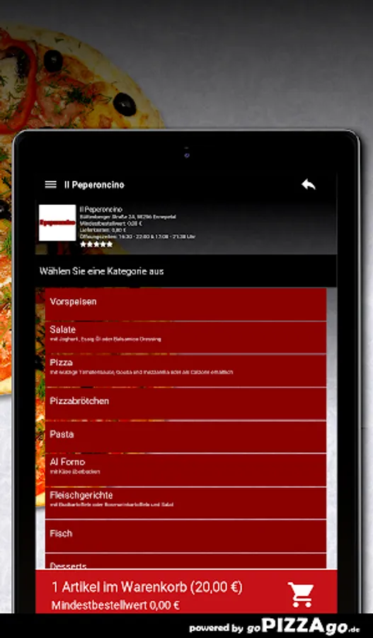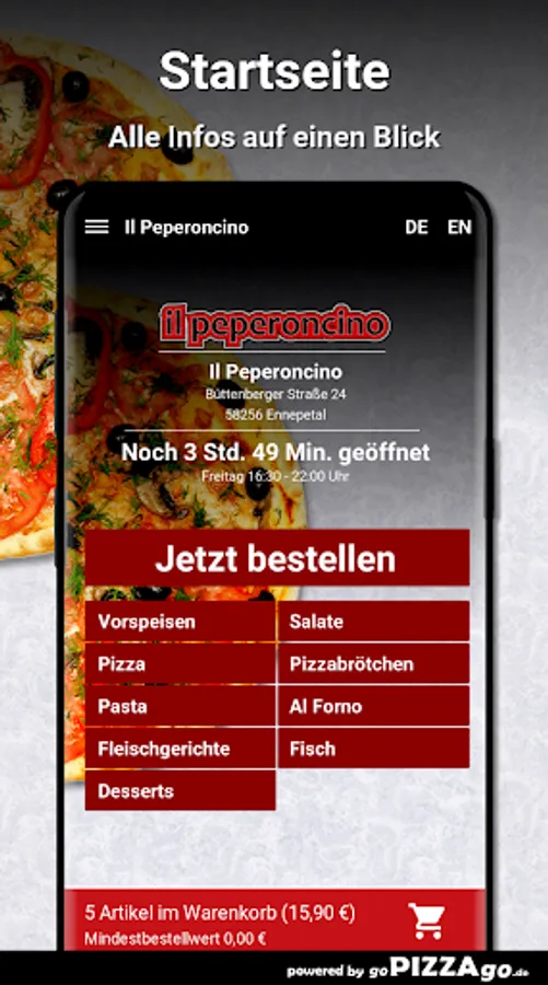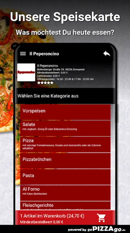 You can order and pay for freshly prepared food online at the delivery service Il Peperoncino (58256 Ennepetal). What do we have to offer? 57 delicacies such as 10 pizza rolls with herb cream, Tris di Pasta al Forno, Penne al Forno and Pizza Funghi for €9.50.The top sellersOur opening hours