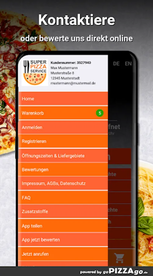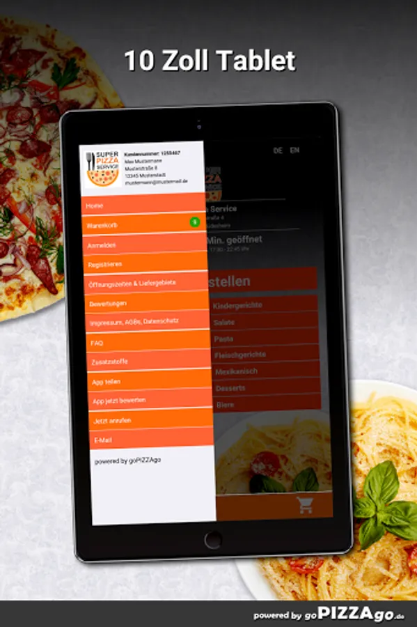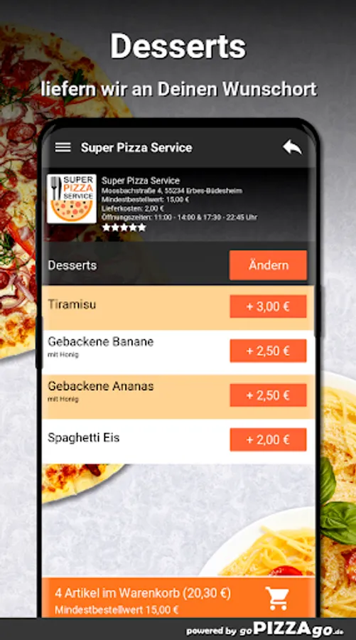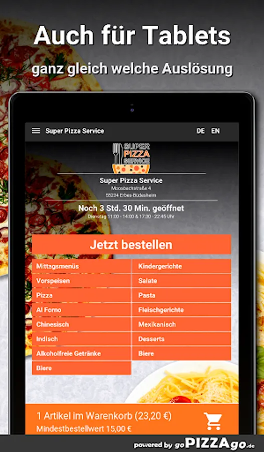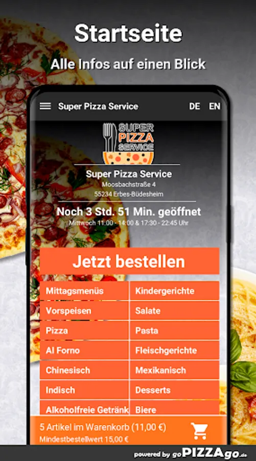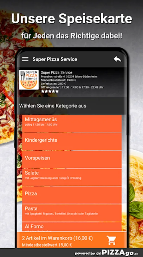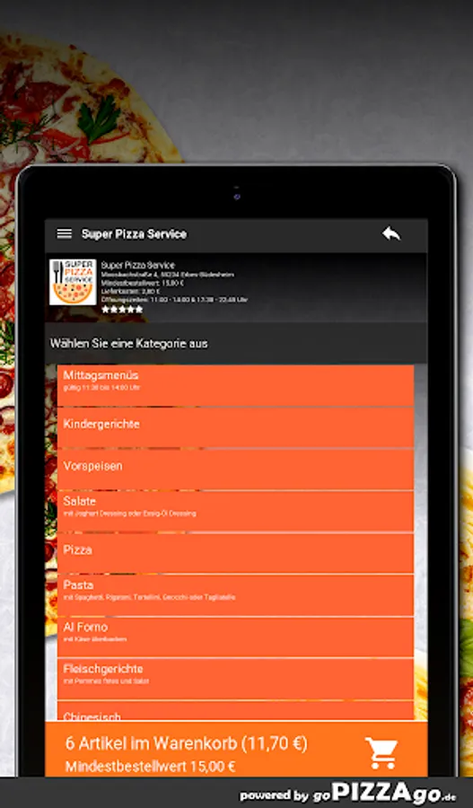 You can order delicacies, food and drinks from our Super Pizza Service here. Choose from more than 174 delicacies. At lunchtime you can order inexpensive meals such as pizza lunch menu (EUR 7.50), duck lunch menu (EUR 10.00), Chinese lunch menu (7.00 euros), pasta lunch menu (7.50 euros)