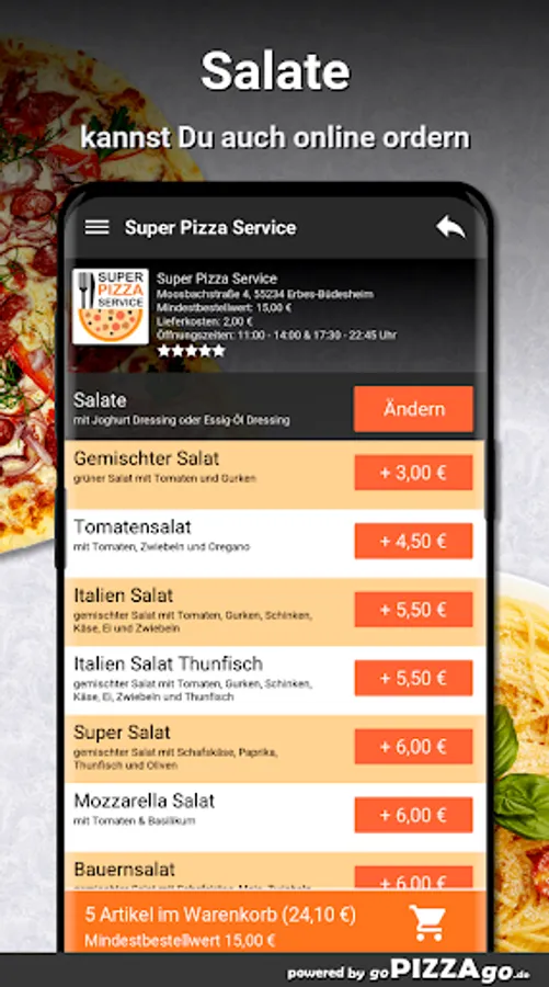 Do you like it vital? How about a salad at the Super Pizza Service delivery service today? Twelve delicious salads are available with Super Pizza Service: Italy salad tuna can be delivered to your place of residence for € 5.50, the delivery service brings you farmer's salad at a price of € 6.00, healthy tomato salad, super salad for € 6.