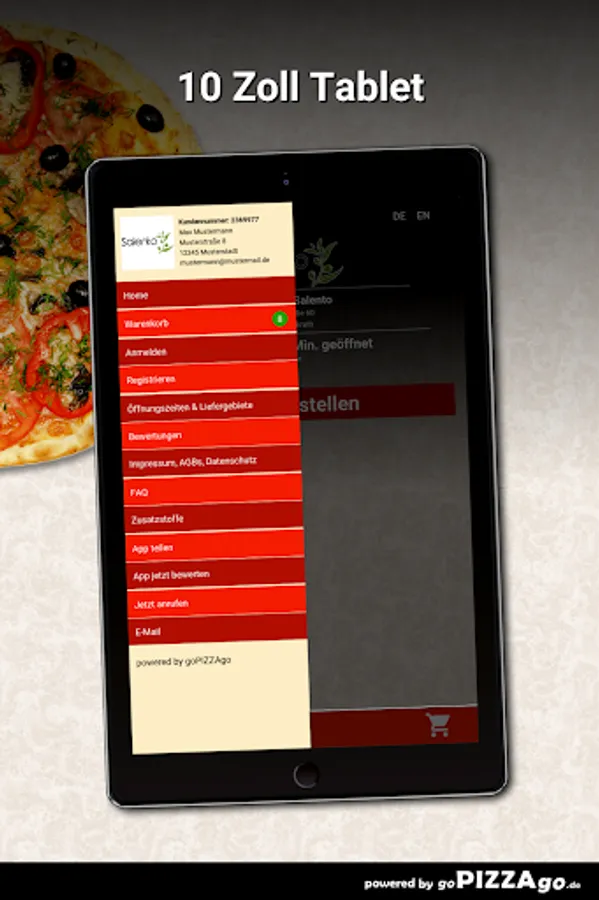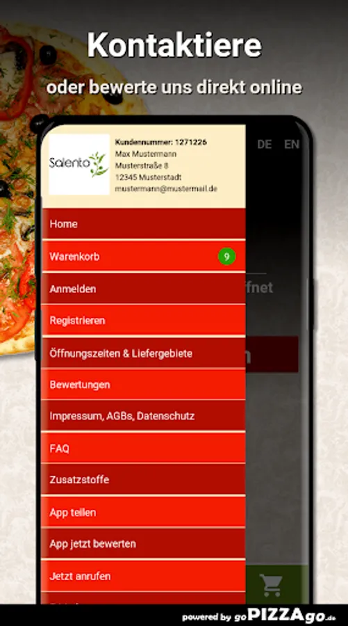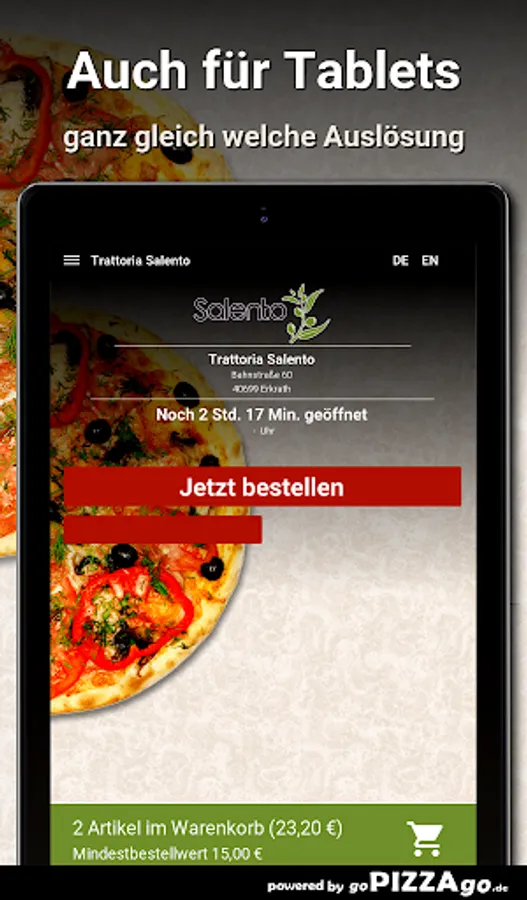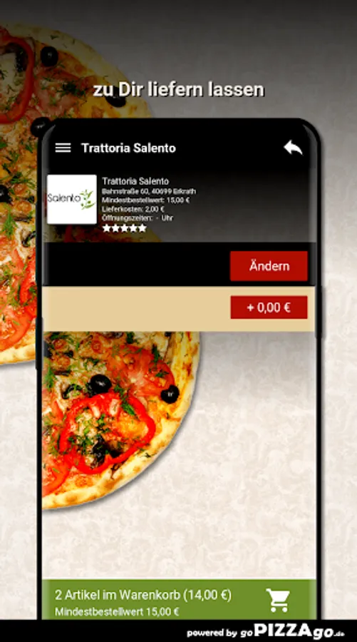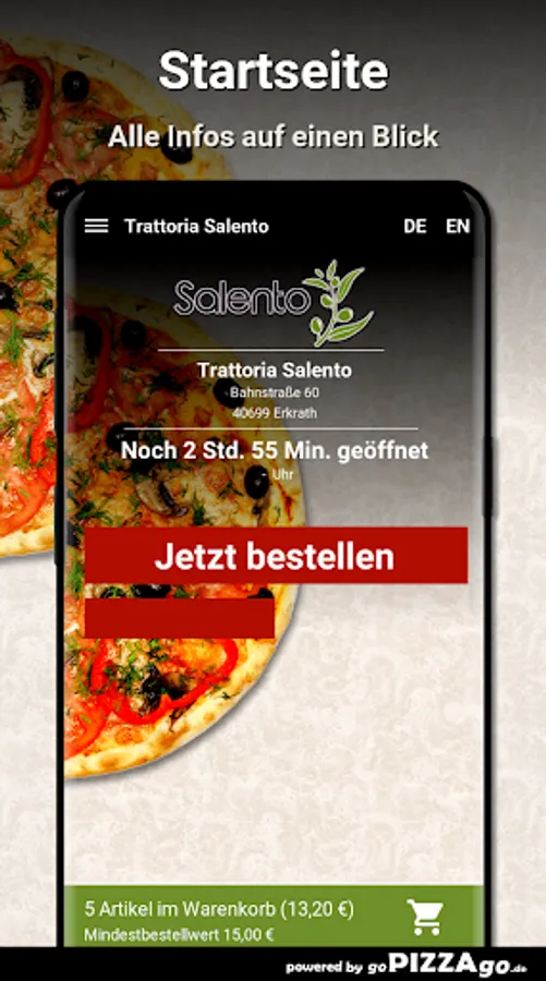 Delicious Pizza Capricciosa, Pizza Mafioso spicy, Pasta Mare e Monti can be found online at Trattoria Salento for just € 7.90, Pizza Napoli (5.00 - 7.50 €), aromatic, tasty Pizza Oceana, Pizza Quattro Stagioni for only € 5.50-8.00. Bruschetta for a fabulous 5.50 euros or Pizza Verdure vegetarian with tomato sauce and cheese is available for 5.50-8.00 euros.
