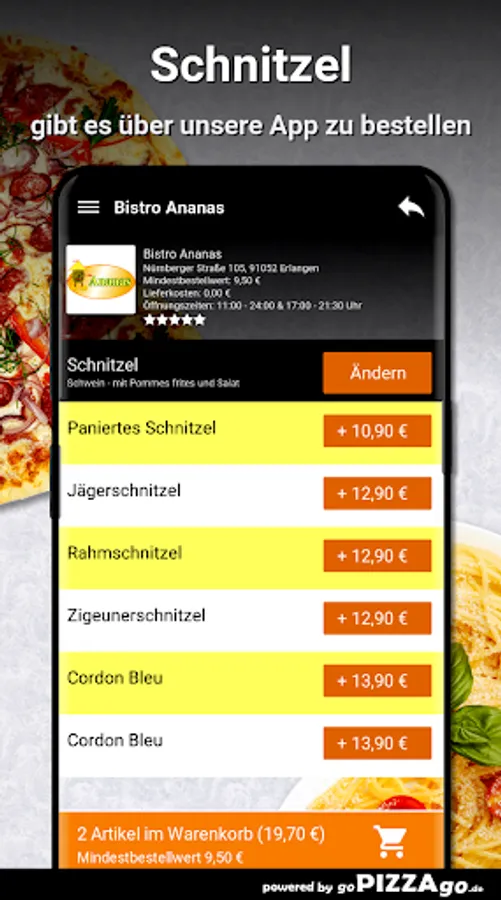 Order the schnitzel - a very popular dish - online at Bistro Ananas ErlangenOur 7 schnitzel dishes are a wonderful offer based on the original recipes. Good cordon bleu is available online here for only € 11.90-13.90. Breaded schnitzel is available for € 10.90, cream schnitzel for an amazing € 12.90. Jägerschnitzel pork - with french fries and salad you can get it online for just € 12.90, schnitzel sandwich with cheese, gypsy schnitzel to bring.