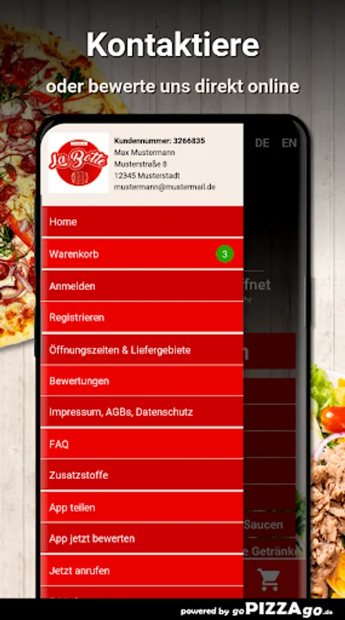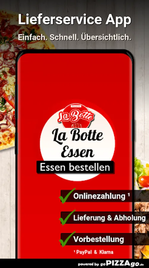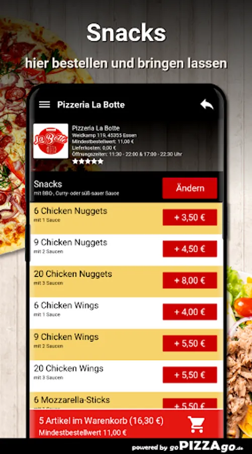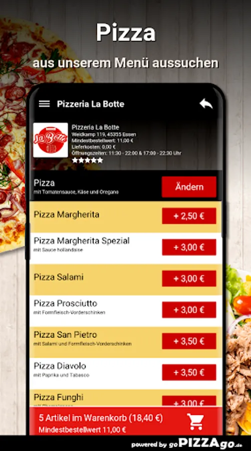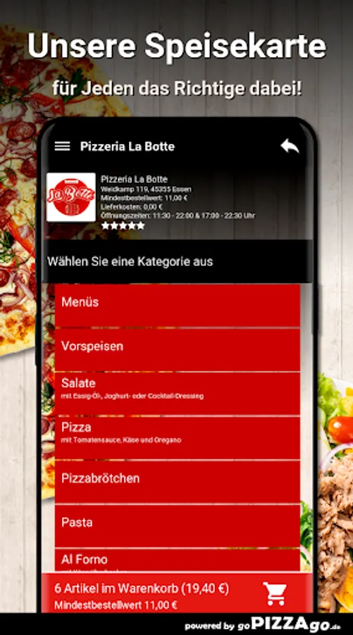 You can order and pay for freshly prepared food online from the delivery service Pizzeria La Botte (45355 Essen). In our menu you will find 174 delicious dishes such as spaghetti all pepe verde, gnocchi pomodoro, 6 filled crab rolls, salad casa, broccoli schnitzel and pizza spinaci e pecorino for 6.00 euros. For dessert we offer: tartofu, tiramisu. Customers find the following specialties bestWhen do we deliver?