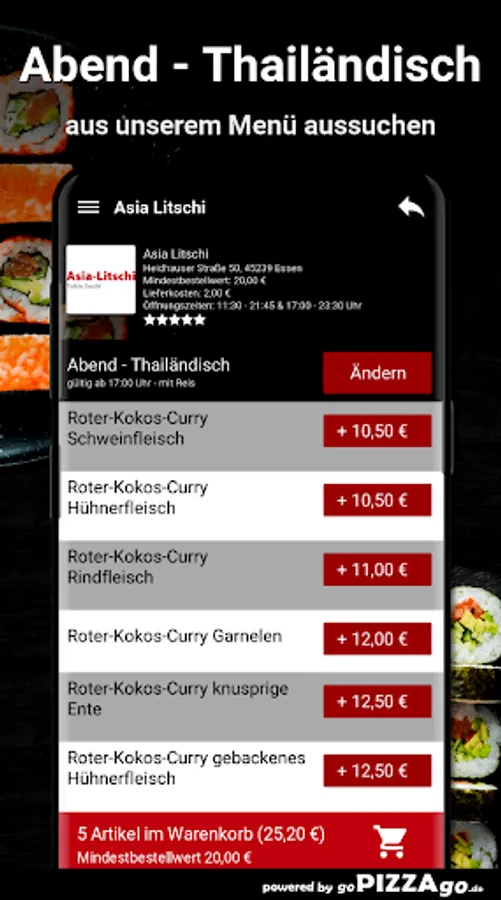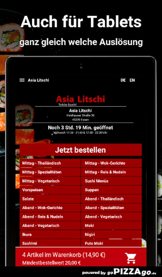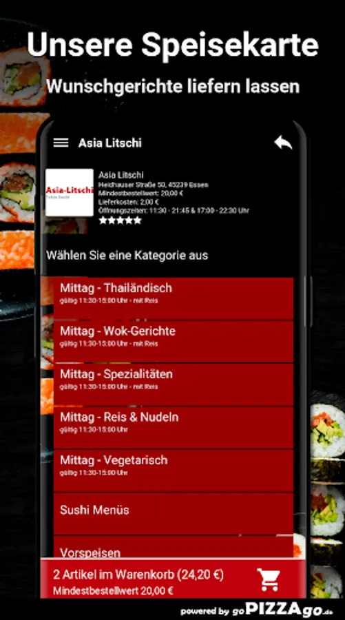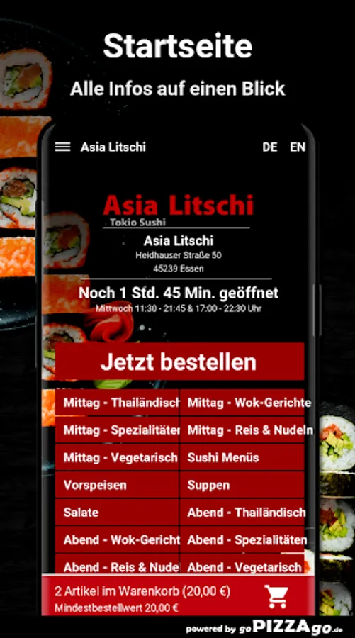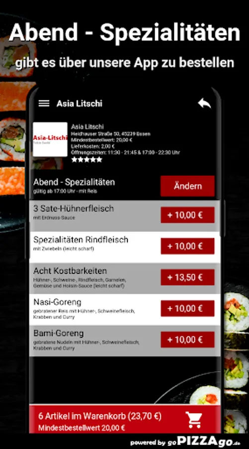 You can safely order delicious and freshly prepared specialties from our Asia Lychee delivery service in Essen here. Choose from a varied range of 364 delicious dishes. After dinner we suggest a dessert: Baked Lychee, Baked Apple, Baked Pineapple, Baked Banana What are our blockbusters? When can I order?