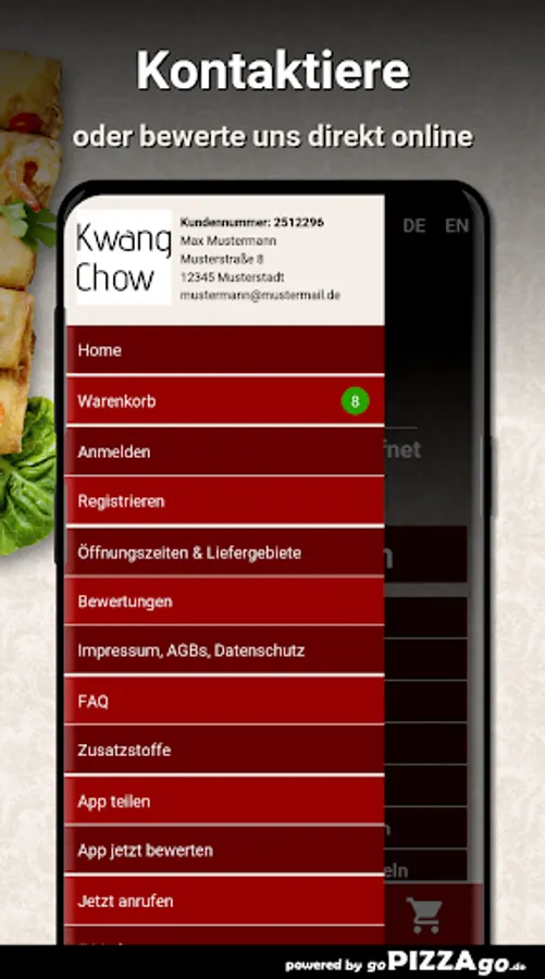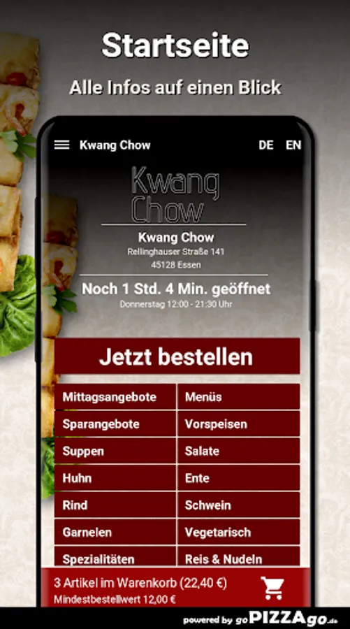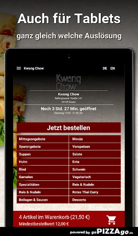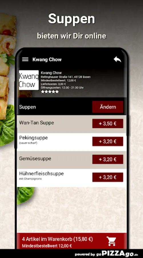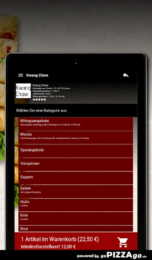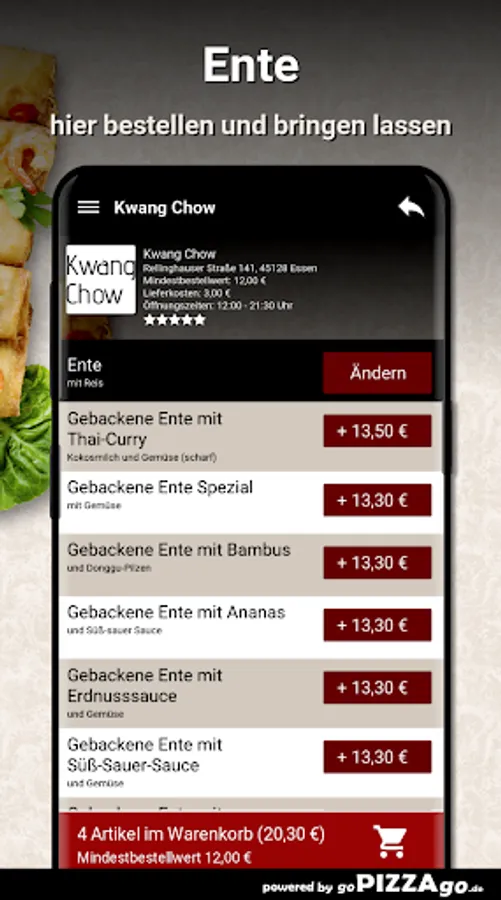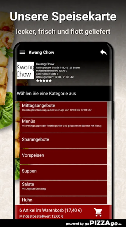 You can order a lot of food or drinks in our online shop at our home service Kwang Chow here. Choose from more than 167 delicacies, including Fried Egg Noodles with Duck, Fried Egg Rice with Beef, Fried Tofu with Vegetables and Thai Curry, Baked Duck Special, Bami Goreng, 6 Curry Corners and Thai Curry with Chicken Breast for 10.50 EUR. We also have lunch such as fried noodles with chicken, fried pork with chop suey, fried egg noodles with crispy chicken breast, fried chicken with Thai curry, fried chicken strips with sweet and sour sauce, fried egg rice with crispy chicken breast strips at fair prices. 7When we deliver your food
