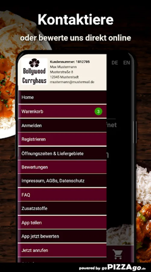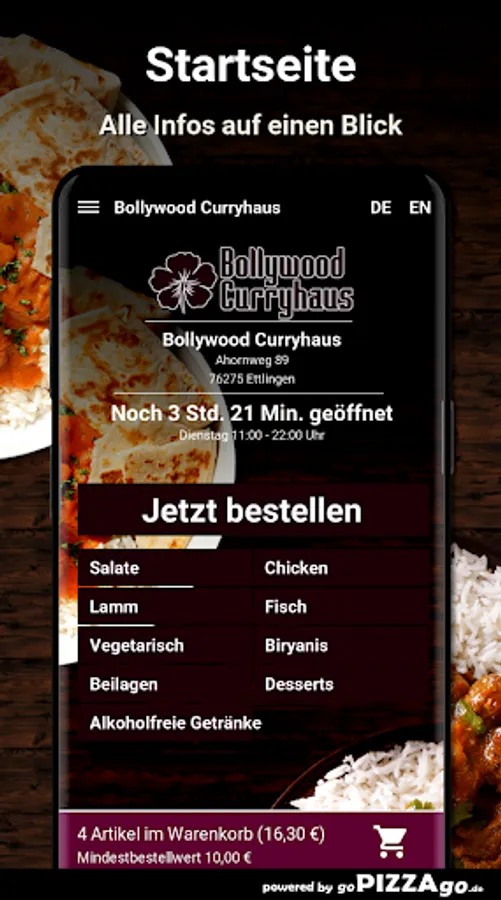 You can put together tempting meals really easily online in our delivery service and have them delivered. We offer you more than 68 delicious dishes, including Lamb Shahi Korma, Chicken Krahi spicy, Chicken Mango, Chicken Shahi Korma. You can also order non-alcoholic beverages, we have lassi sweet, mango lassi, mineral water, Fanta, Mezzo mix, mango juice. What do customers like the most? Bollywood Curryhaus is open at the following times