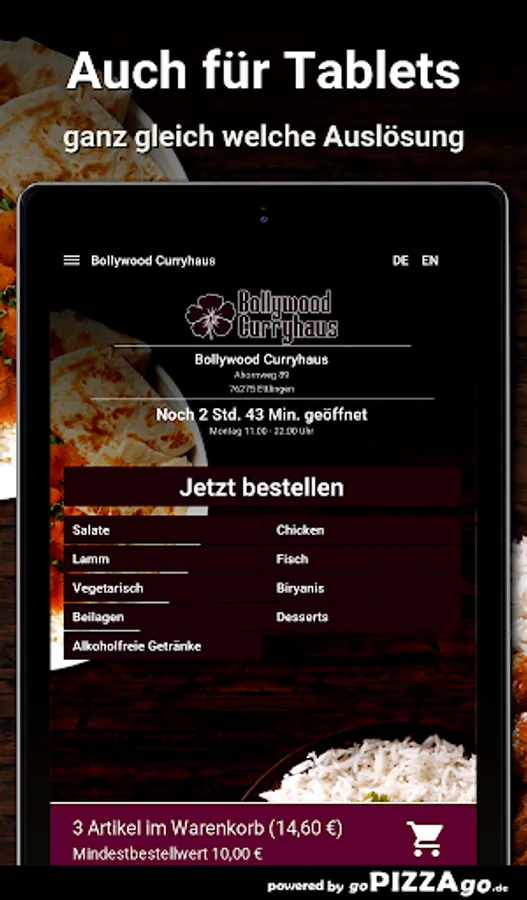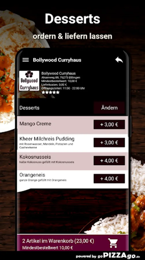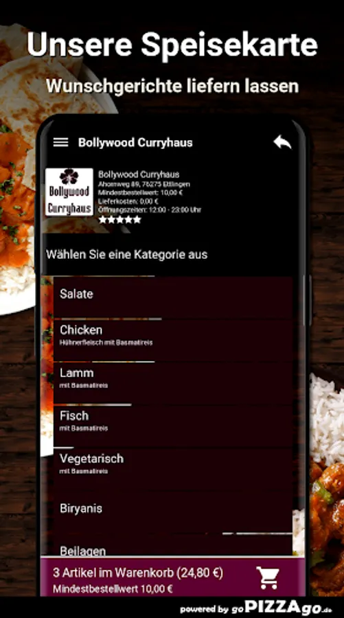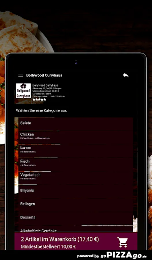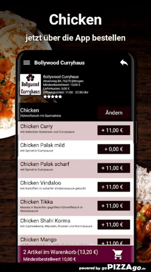 Feasting on the culinary dishes of India? Uncomplicated with the delivery service in Ettlingen A tasty online selection of Indian dishes with 39 delicious dishes are offered here. You can get vegetarian biryani at Bollywood Curryhaus for € 11.00, Palak Paneer for € 9.50.