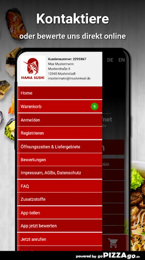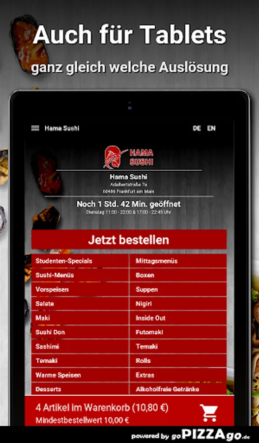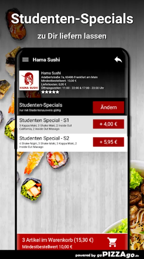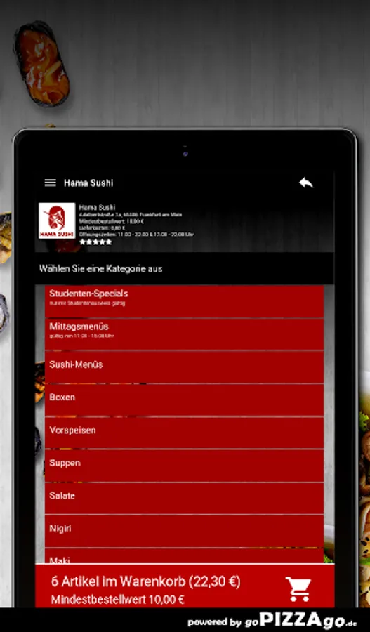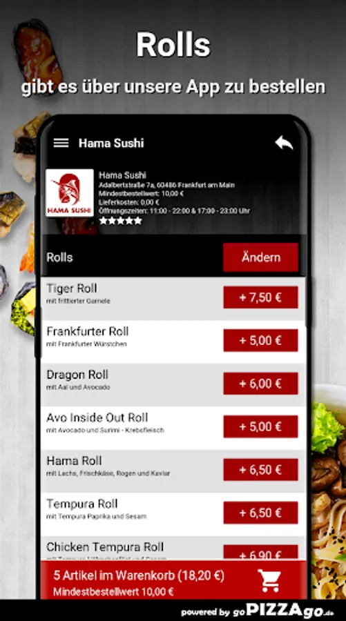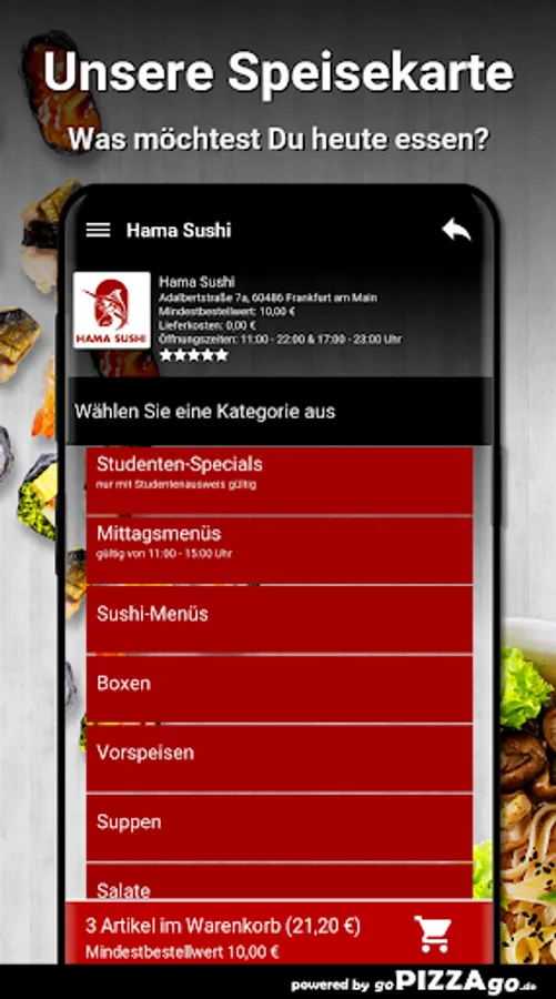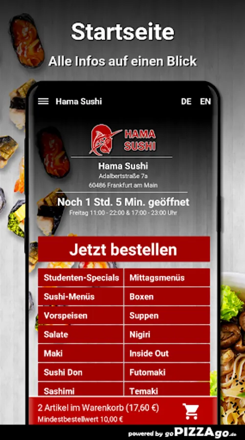 Welcome to Hama Sushi in Frankfurt am Main In Frankfurt am Main you can order boxes, warm dishes, sushi menus and Inside Out online at Hama Sushi.