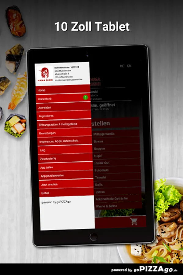You can order and pay for delicious & fresh dishes online from us. You can expect an absolutely tasty range of over 149 delicacies such as sushi menu - Party Box 2, Ika Nigiri, Young Corn Nigiri, Tekka Avo Maki, sushi menu - Maki Box small, Kappa Maki or squid salad Nigiri for € 1.80. You can also order drinks, we have still water, Coca-Cola, mineral water, Fanta, Ginger Ale, Sprite. Our delivery service also offers affordable lunch options such as lunch menu - M1 (EUR 9.50), lunch menu - M2 (EUR 5.95), lunch menu (€ 7.50)