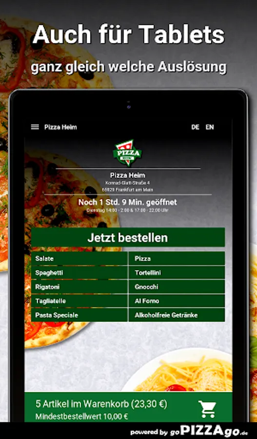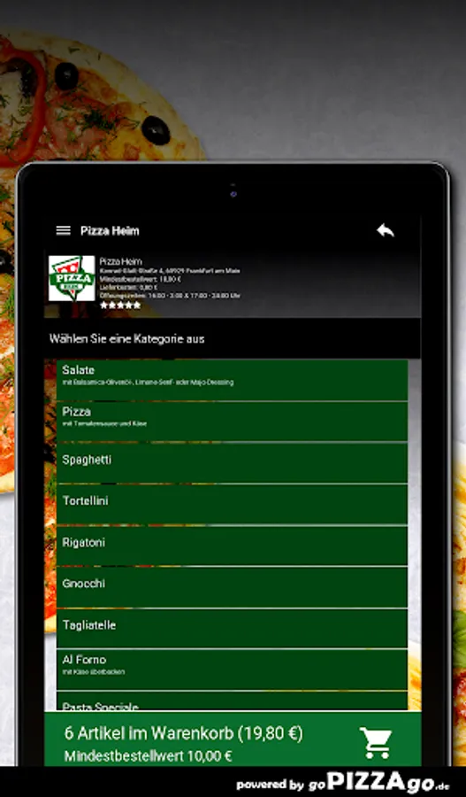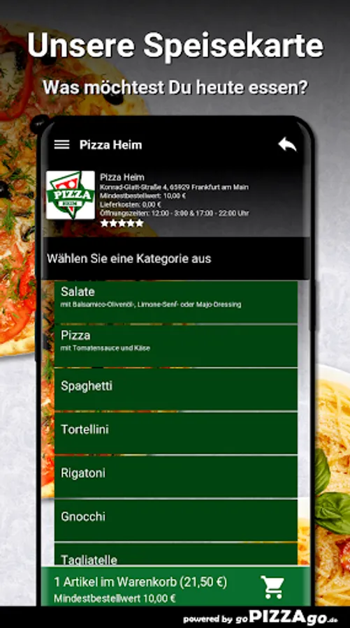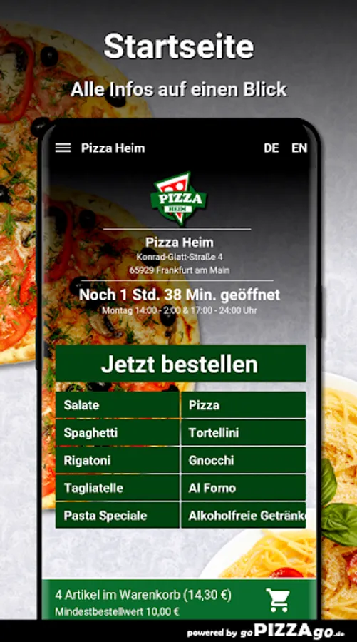 You can order and pay for hearty delicacies online from our Pizza Heim delivery service in Frankfurt am Main. We have 76 feasts online, including Gnocchi Napoli, Gnoccchi Gorgonzola, Pizza Salami, Insalata Caprese, Pizza Broccoli, Pizza Tobrino, Tagliatelle Bolognese or maybe Spaghetti di Pollo for 7.00 EUR. Our 7 top hits Our opening times