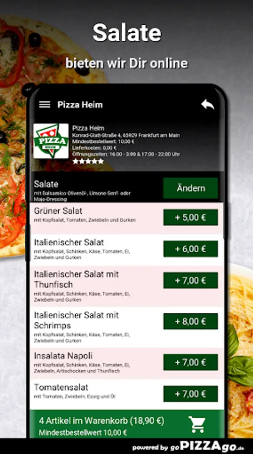 In Frankfurt am Main you can also order delicious mouth-watering salads from Pizza Heim Delicious & vital salads with fresh vegetables are offered by Pizza Heim. You can get chicken salad, Italian salad with shrimp at Pizza Heim for € 8.00, Insalata Contadina for a fabulous € 10.00, Insalata Marina brings you the delivery service for € 15.00 & tomato salad is available for € 5.