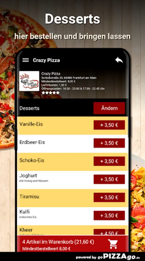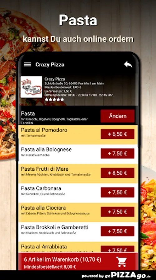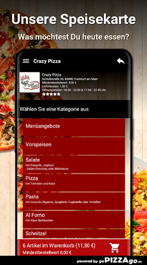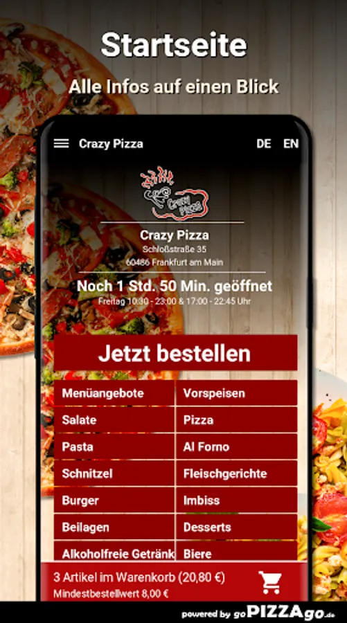 Welcome to Crazy Pizza in Frankfurt am MainWith us you can order starters, snacks, pasta, salads, meat dishes, burgers, pizza, schnitzel easily online!