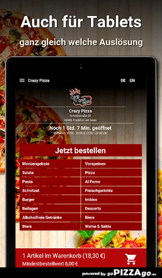 You can order many dishes in our online shop from Heimservice Crazy Pizza (60486 Frankfurt am Main) and have them delivered to your office or home. You will find 116 freshly prepared dishes online in our menu, including Insalata di Pomodori, Pizza Calzone, Insalata Hawaii, Pizza Special Indian, Pizza Mafioso, Double Hamburger, Pasta al Ragu, Pasta Broccoli e Gamberetti and Pizza Crazy for 7.50 euros. Customers find the following specialties best: Crazy Pizza is open at the following times
