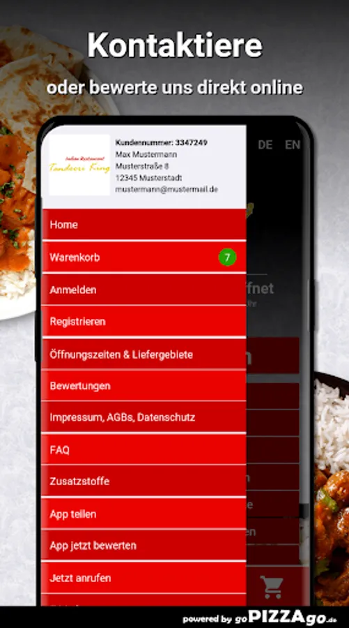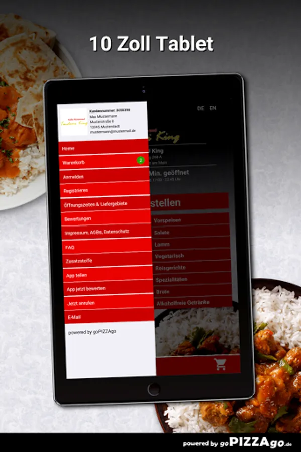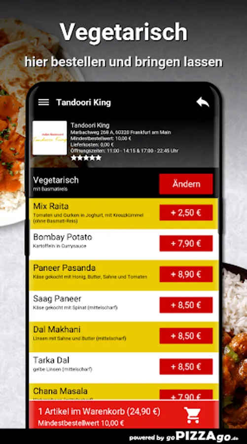 Order delicious Indian food and have it delivered by the Tandoori King Frankfurt am Main delivery service.We offer you delicious dishes based on original Indian recipes online. Chicken madras with basmati rice can be ordered for € 11.90, Kofta Masala, Bhindi Gosht can be brought to you by the delivery service at a price of € 12.90, Murgh pineapple with basmati rice can be ordered for € 11.90, lamb mango can be ordered for € 12, 90 €, delicious Chicken Jalfrezi delivered to your place of residence at high speed, the delivery service brings you tasty Chicken Biryani directly to your home at a price of 9.50 €. Butter Chicken (€ 9.50), Veg Jalfrezi € 10.50 and Paneer Pasanda with Basmati rice are available for € 8.90. Let Tandoori King spoil you with culinary delights!