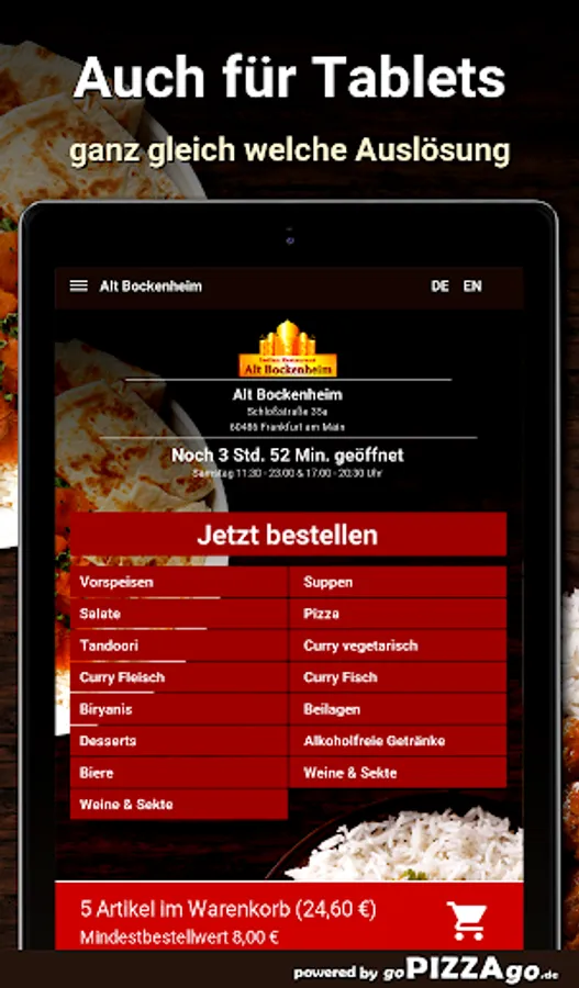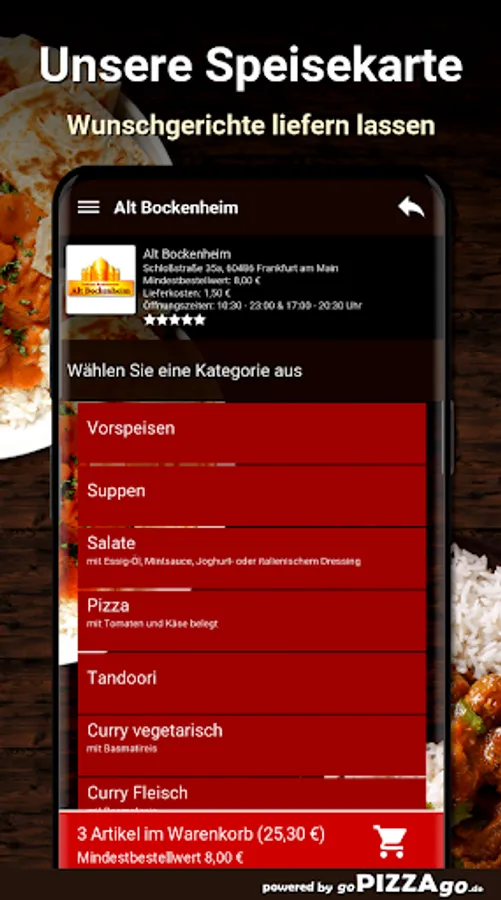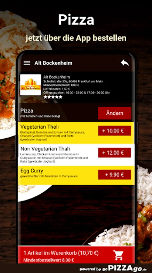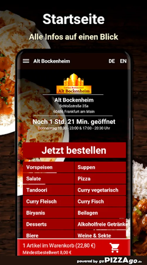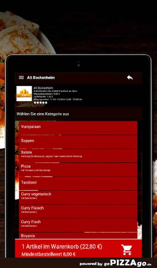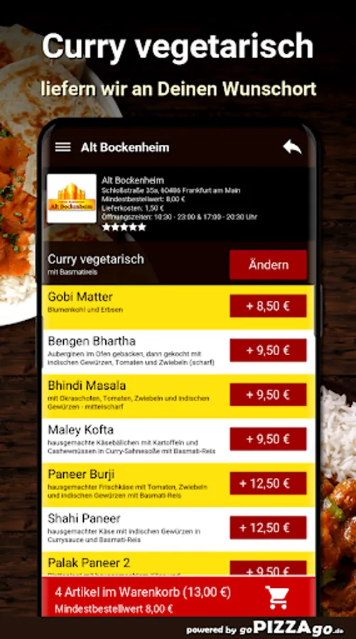 Welcome to Alt Bockenheim in Frankfurt am MainYou love curry fish, tandoori, soups, starters, biryanis, vegetarian curry, pizza .. Freshly prepared to pick up or have it delivered?
