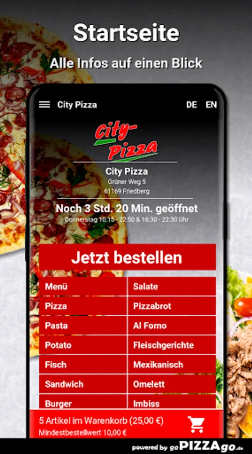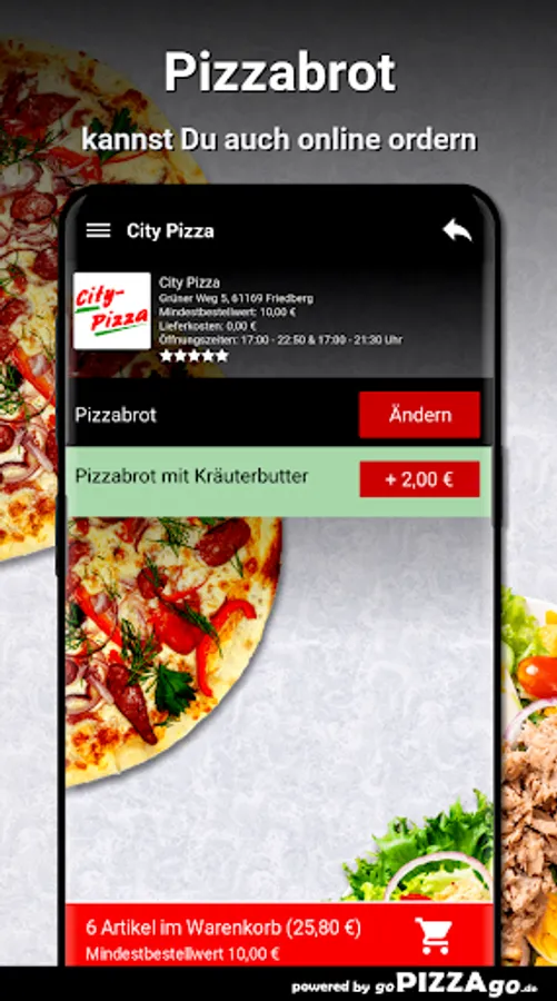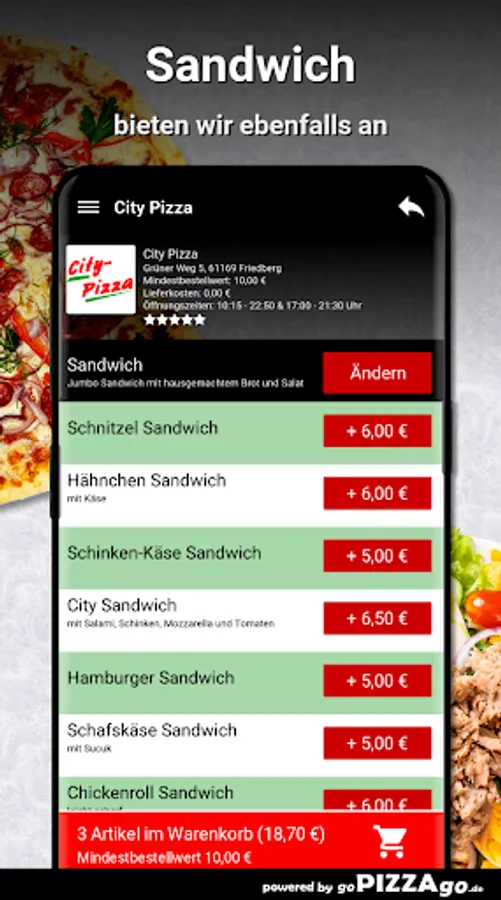 Welcome to City Pizza in Friedberg. With us you can also order snacks, sandwiches, salads, burgers, pizzas and have them delivered.