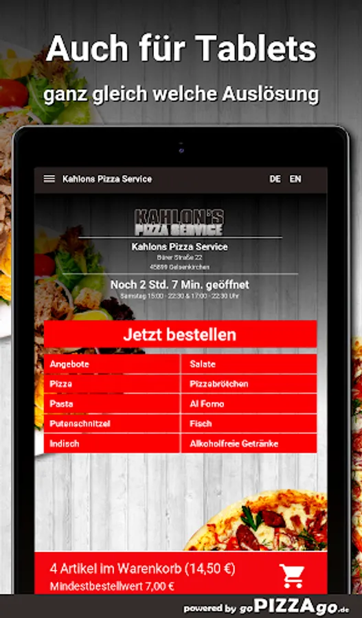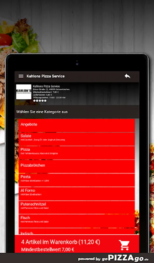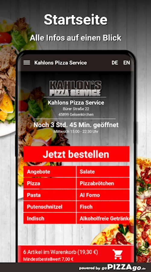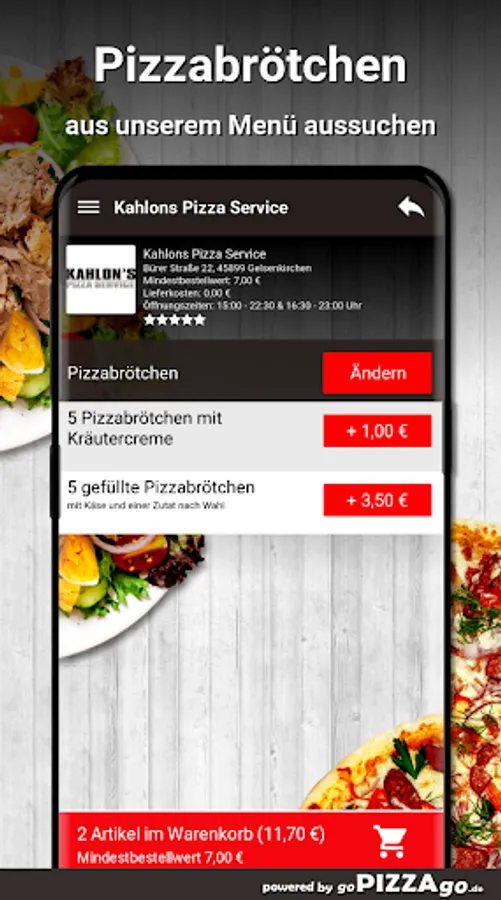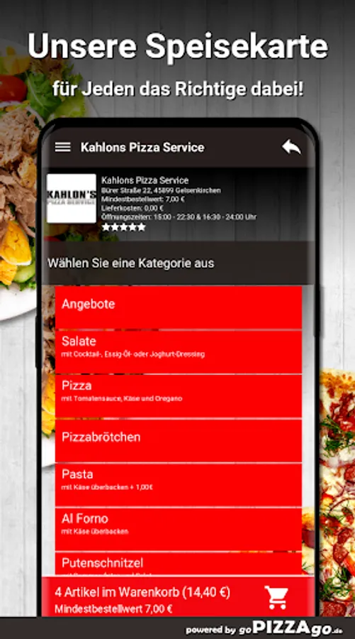 Welcome to Kahlons Pizza Service in GelsenkirchenWe deliver salads, pizza rolls, turkey schnitzel, fish, pizza ... really freshly prepared to pick up or have it delivered.