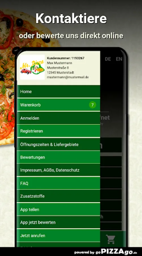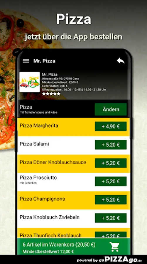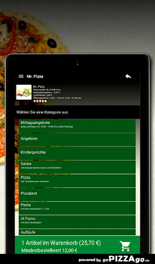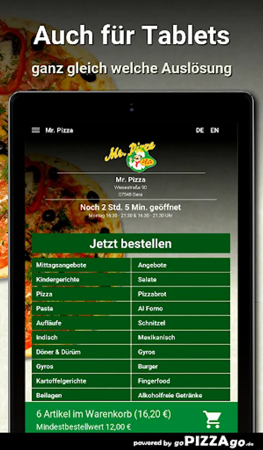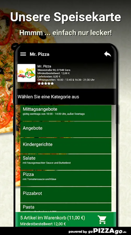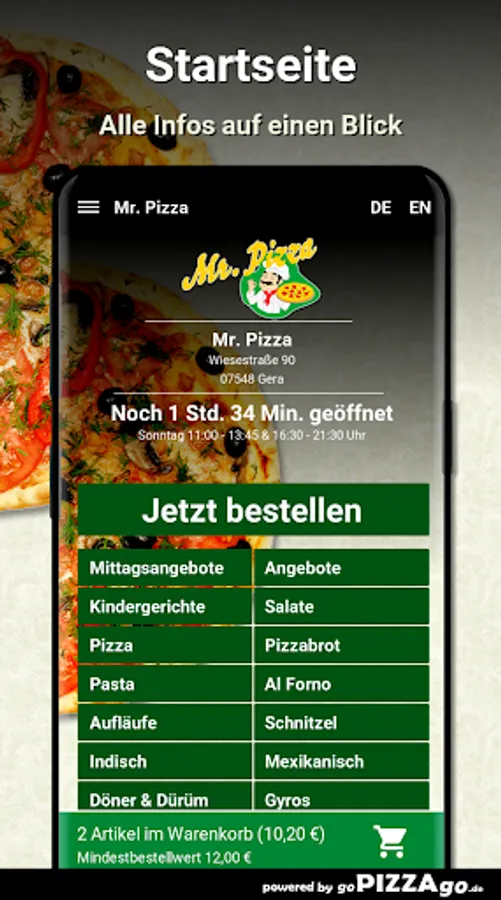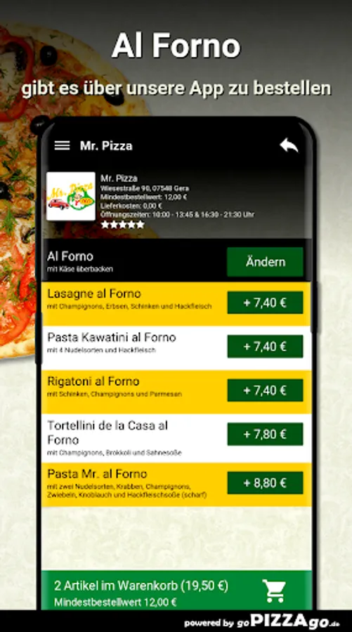 Welcome to Mr. Pizza in Gera. At Mr. Pizza you can order pasta, finger food, Al Forno, Mexican, schnitzel, casseroles, Indian ... totally freshly prepared.