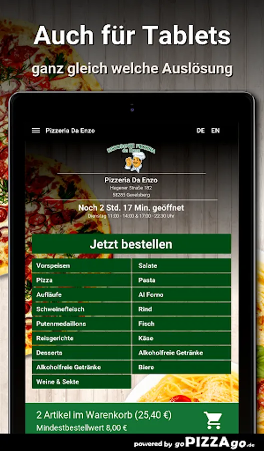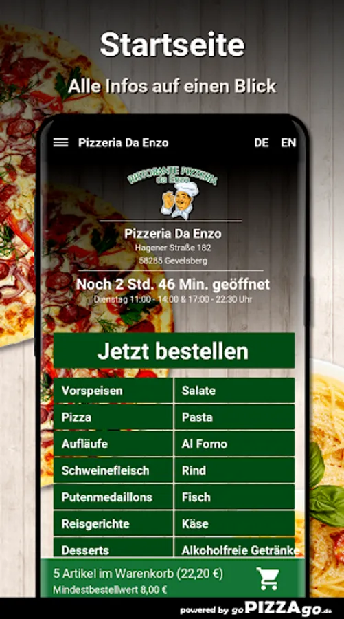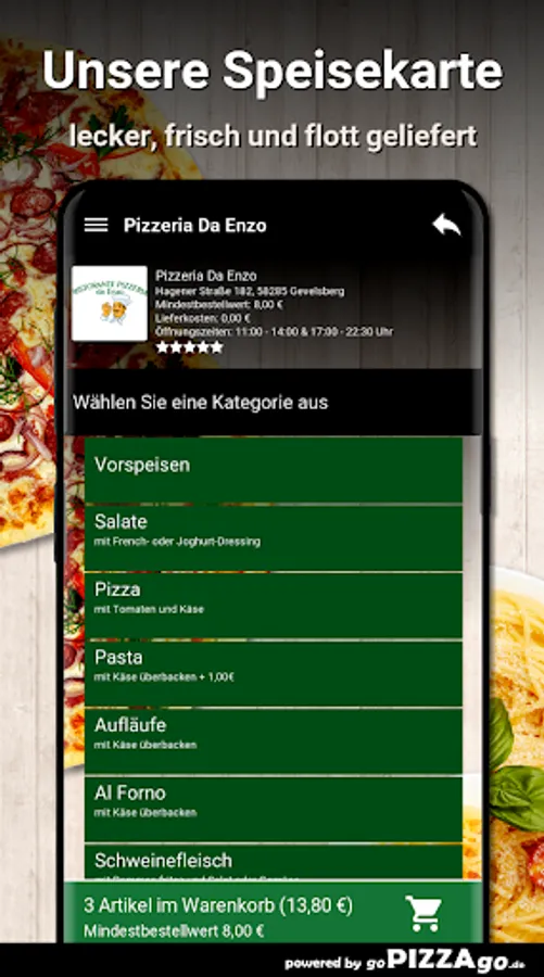 Order food online at Pizzeria Da EnzoAt Pizzeria Da Enzo you can order fish, salads, pasta, cheese, casseroles, beef and pizza here and have them delivered!