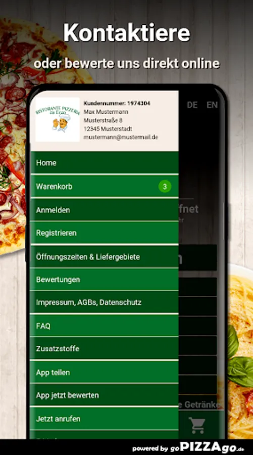You can of course order numerous dishes from our pizza service and have them delivered to your office or home. We offer you more than 138 dishes (Insalate Cetrioli, Pizza France, Gnocchi al Pesto, Tagliatelle al Gambretti e Curry, Macaroni Saltati, Pizza Bomba). After feasting, you can enjoy a dessert like tiramisu. You can order our 7 top hits at these times