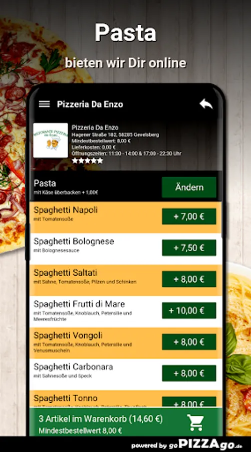 Feast with friends or family with the tempting pasta creations from Pizzeria Da Enzo GevelsbergDelicate & fresh! Also try the fine pasta dishes at Pizzeria Da Enzo! Tortellini Bolognese with Bolognese sauce. Pasta Di Diaginto, Spaghetti Vongoli + € 1.00 is available from Pizzeria Da Enzo for just € 8.