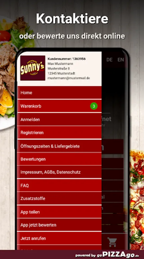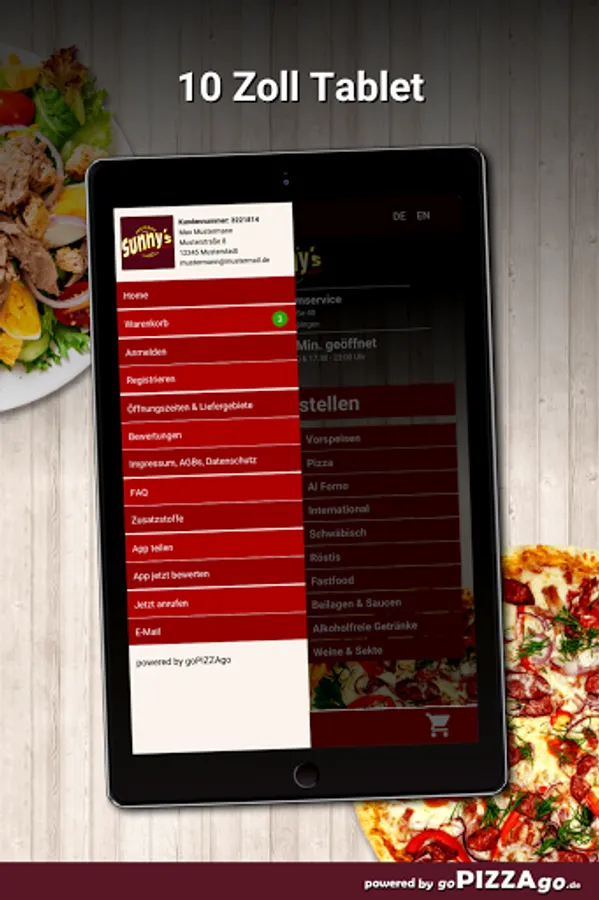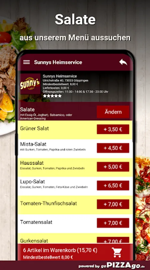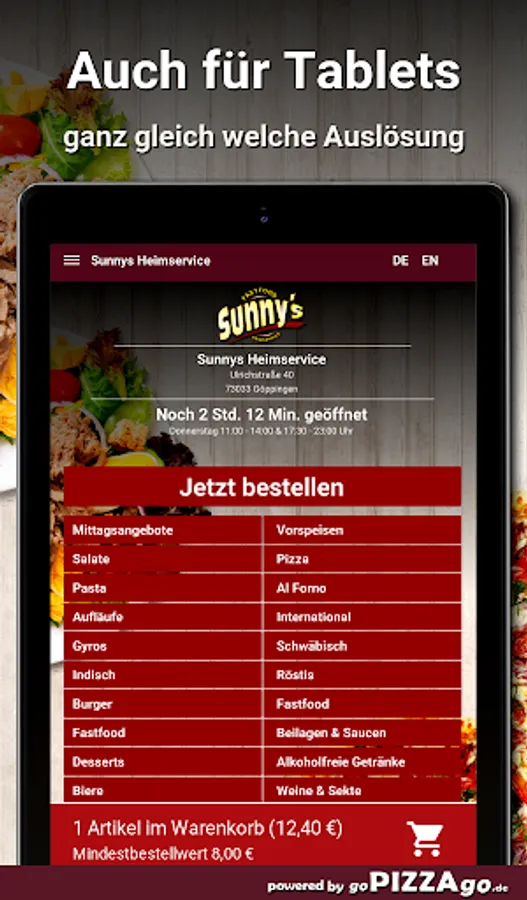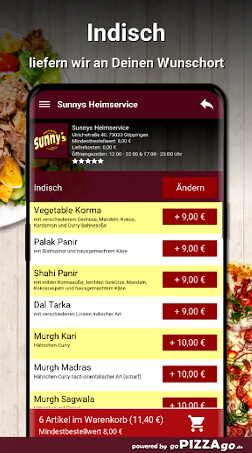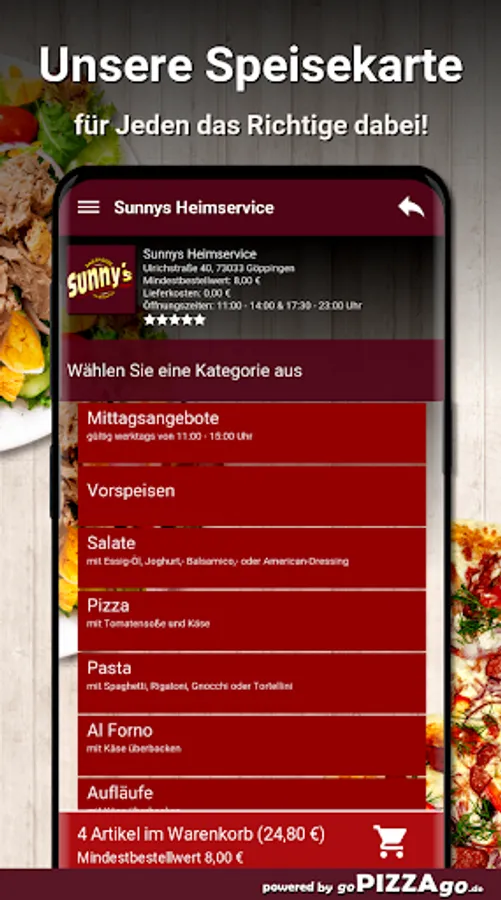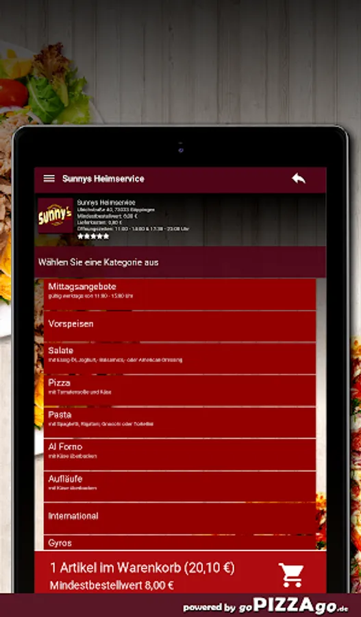Of course, you can quickly order a large number of dishes from our pizza delivery service in our online shop and perhaps have them quickly brought to your own four walls. The range of our varied dishes includes 220 dishes such as Murgh Kari, 2 breaded schnitzel, pasta alla penne, 2 chili burgers, vitamin bomb or pork schnitzel Bolognese for € 10.00. We also offer you inexpensive lunch: 1 Indian dish (EUR 7.50), 1 pizza 60x40cm (€ 16.00), 1 pasta dish (EUR 6.50), 1 Chinese chicken dish (EUR 7.00), 1 pizza 26cm (Euro 6.50). This is what is usually ordered from usSunny's home service is open at the following times