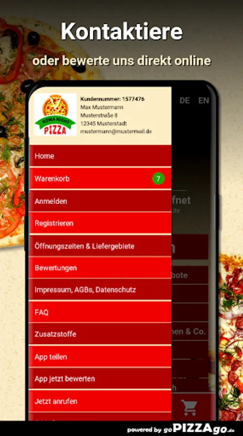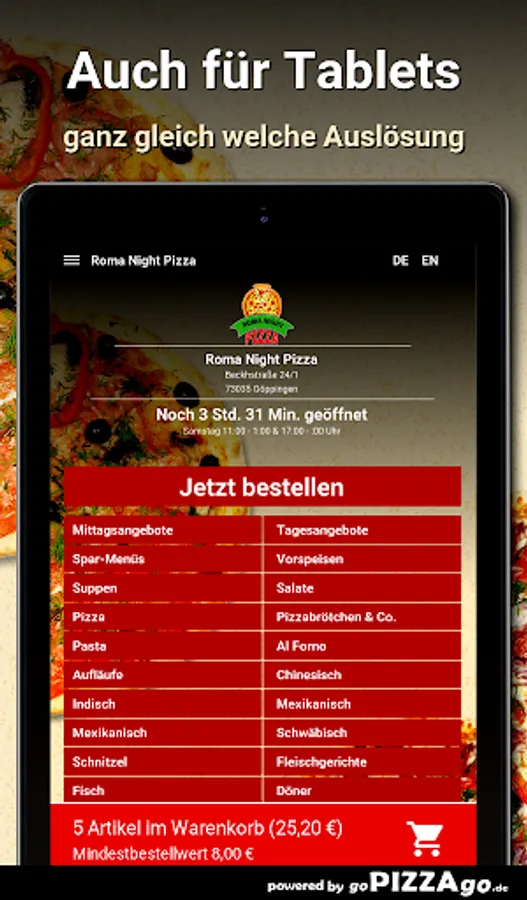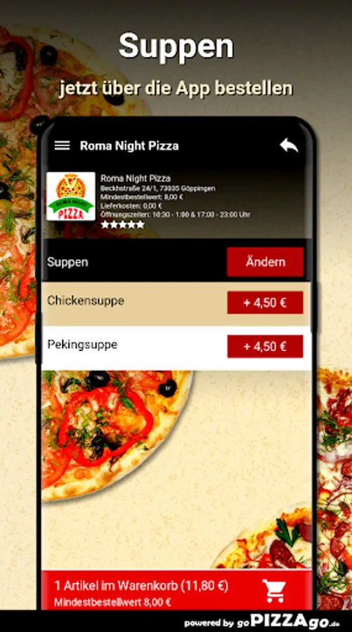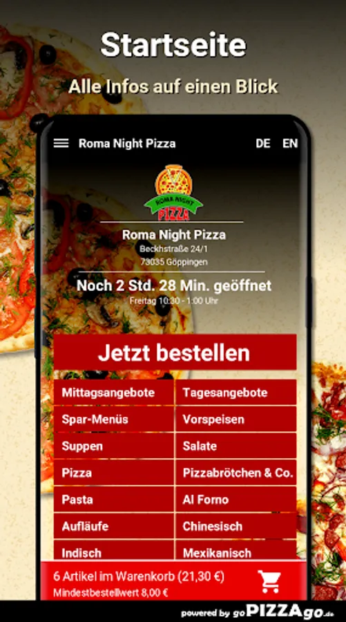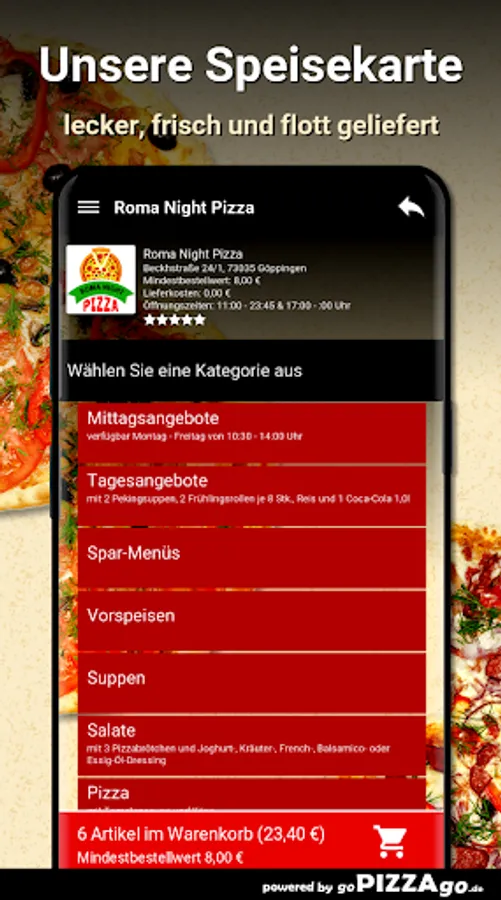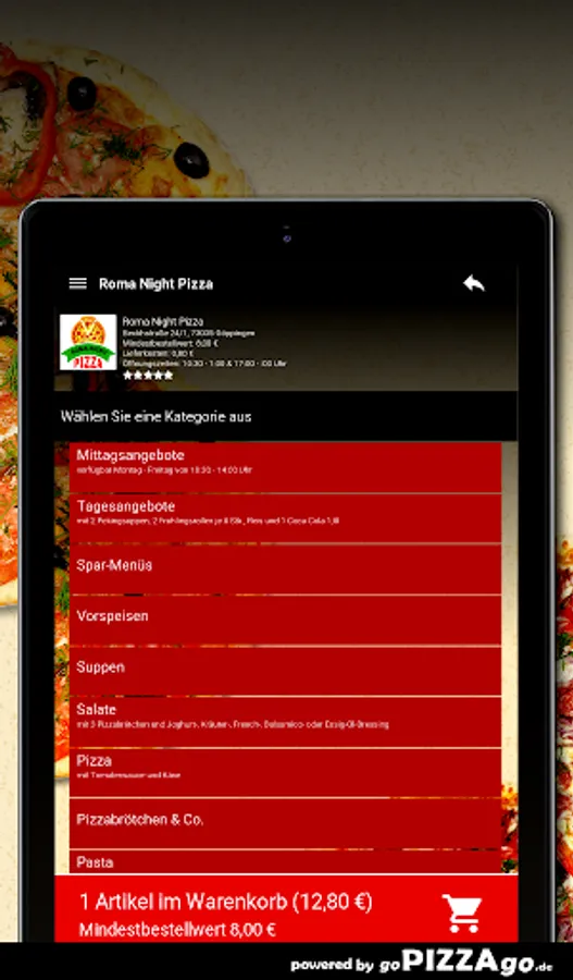 You can easily order a lot of food and drinks in our online shop in our pizza delivery service and have them delivered immediately. Choose from more than 371 delicious dishes such as Chicken Korma, Fried Rice, Pizza Capricciosa or beef with vegetables for € 11.00. The Roma Night Pizza delivery service also offers you inexpensive lunchtime offers such as pasta dish al Forno, party pizza, Chinese.Our top 7 itemsWe deliver at these times