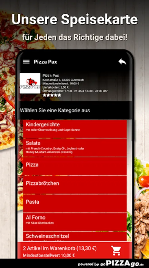 You can order and pay for delicious, fragrant food online at our Pizza Pax home service in Gütersloh. A selection of 223 foods or drinks awaits you: Pizza bread with cheese, Pizza Supreme Cheesy, Tuna Salad, Ciabatta Sheep Cheese, Spaghetti Cheese Cream, Wings and Ribs, Garlic Baguette Chicken for 4.00 euros. Would you also like to have something delivered for the little ones? We have Spaghetti Bolognese, Little Star, Mini Pizza Salami on offer, and most of the times we order these We deliver at these times