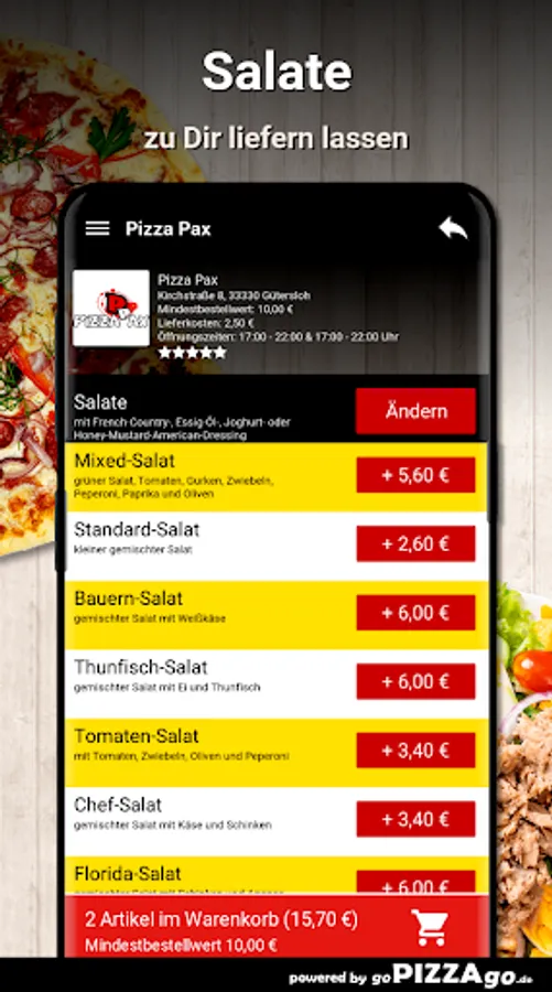 Freshly prepared standard lettuce is available online here for just € 2.60, farmer's lettuce, tomato salad. Florida salad, mixed salad can be delivered for € 5.60 and Pizza Pax has an absolutely delicious tuna salad for just € 6.