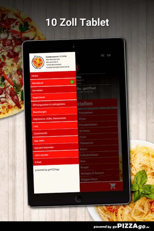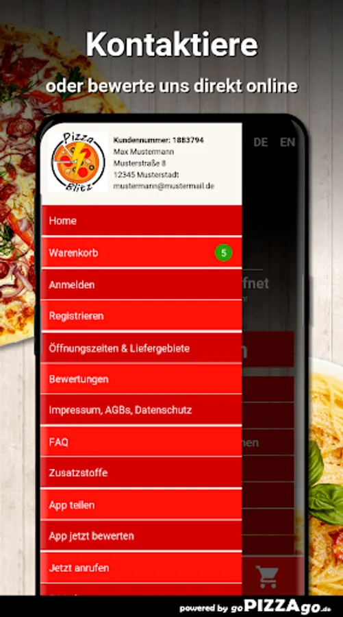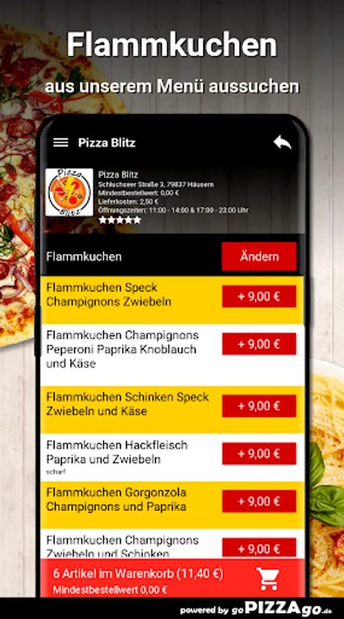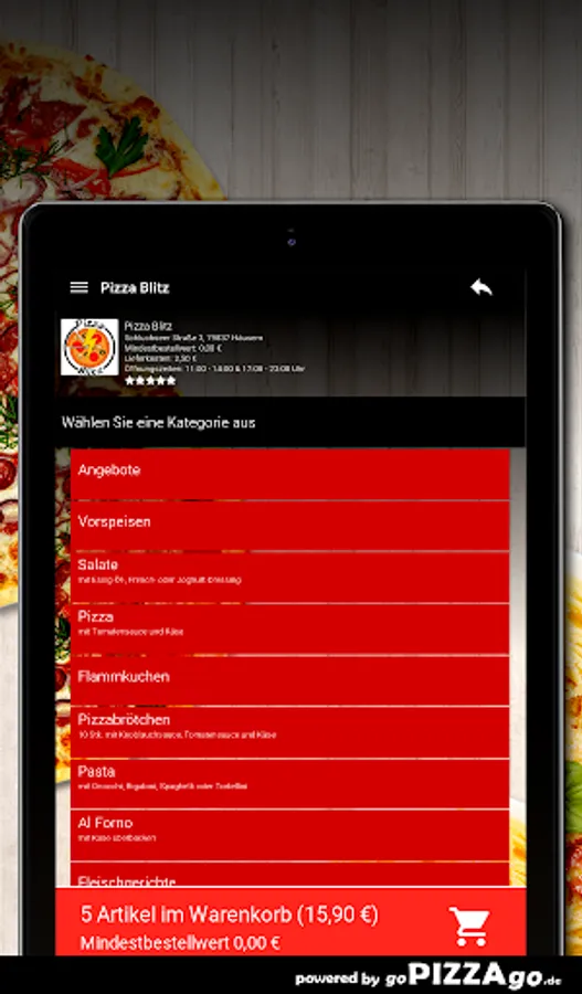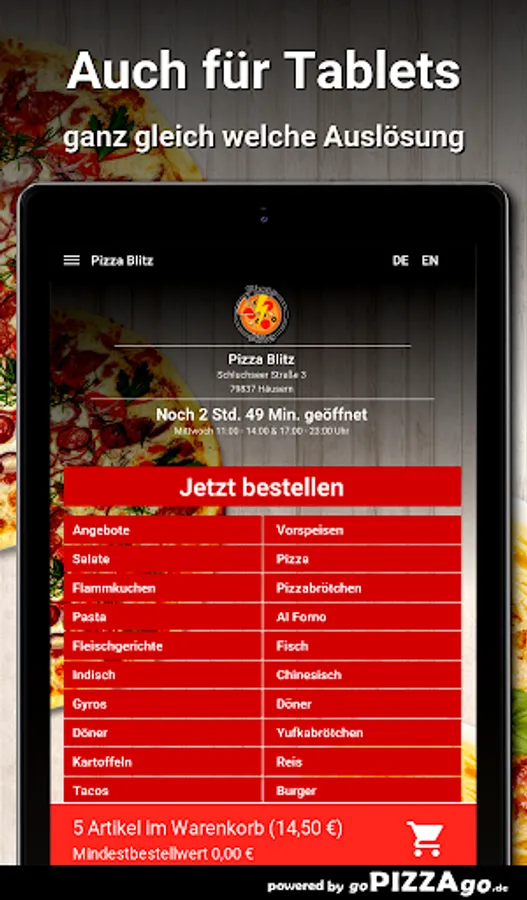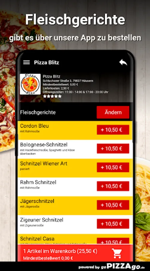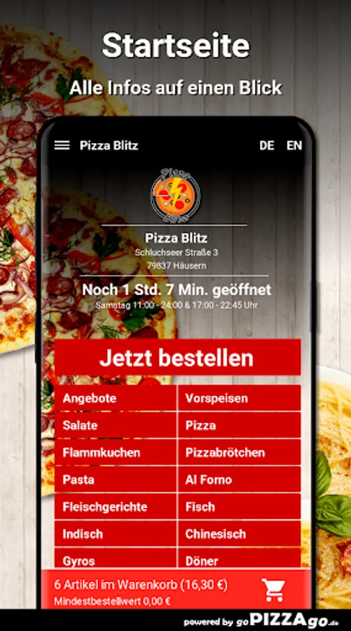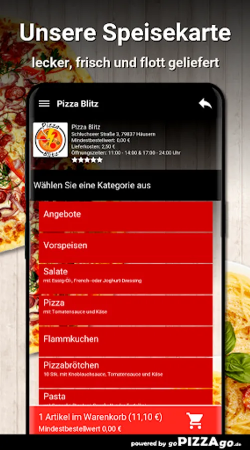 You can order delicious food or drinks from the Pizza Blitz delivery service (79837 houses) and have them delivered to your office or home. We offer you more than 382 fresh dishes such as fish nuggets burger for EUR 6.00 or Tyrolean roast beef for EUR 16.50. Our top 7 hits Our opening times