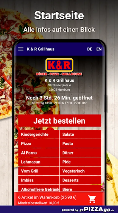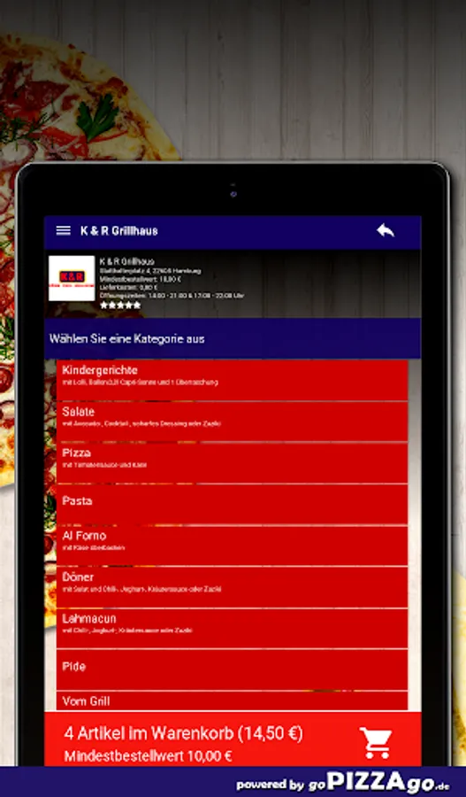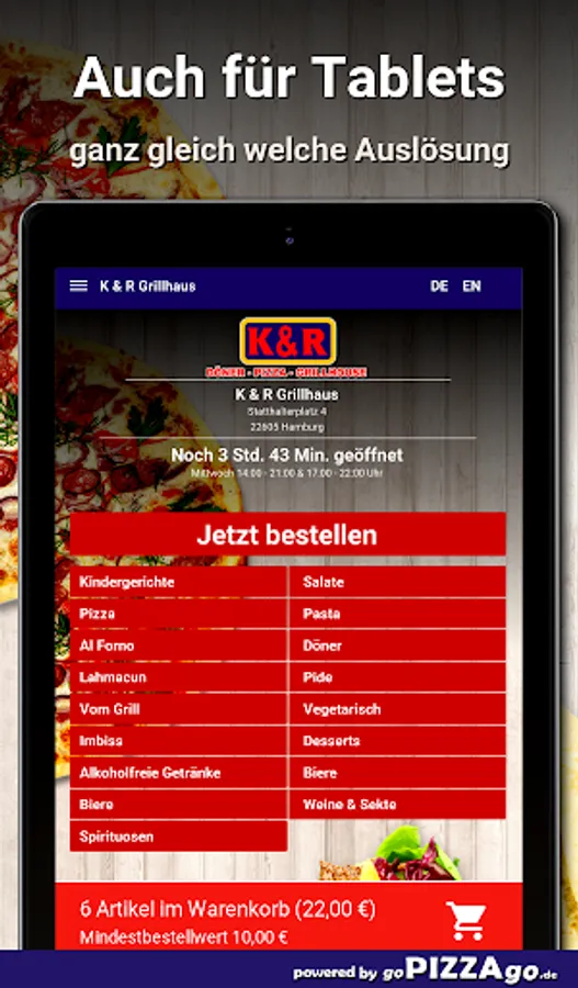 Of course, you can conveniently order and pay for delicious food online from the K & R Grillhaus delivery service (22605 Hamburg). We also offer you 99 dishes such as vegetarian bread bags, mini kebab in bread, Dürüm vegetarian, lahmacun kebab veal, tavuk sis, penne with minced meat or lahmacun with salad and sauce for € 4.30. The offspring can choose between numerous fresh dishes such as Kiddy Box Nuggets, Kiddy Box Doner meat.What are our top sellers? Our delivery times are