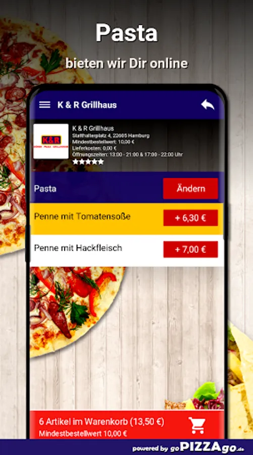 Discover delicious Italian delicacies such as cannelloni, antipasti, lasagna with the delivery service K & R Grillhaus ... The cuisine of Italy at K & R Grillhaus is very varied and tasty. Choose from eleven Italian cuisine dishes. Pizza ham to your current location. Pizza sucuk for € 9.50, vegetarian pasta casserole right on your doorstep, penne with tomato sauce for an amazing € 6.30 and also excellent salami pizza (€ 9.10).