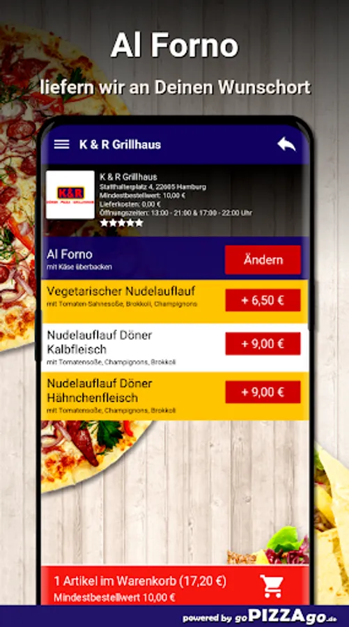 Casseroles with meat or vegetarian - let yourself be inspired by K & R Grillhaus in Hamburg If you have a craving for delicious gratinated foods, you are at the right internet address at K & R Grillhaus. The most delicious fragrant pasta casserole doner veal (9.00 €), noodle casserole doner chicken meat is available here online for only 9.00 €, vegetarian pasta casserole is available for 6.50 €.