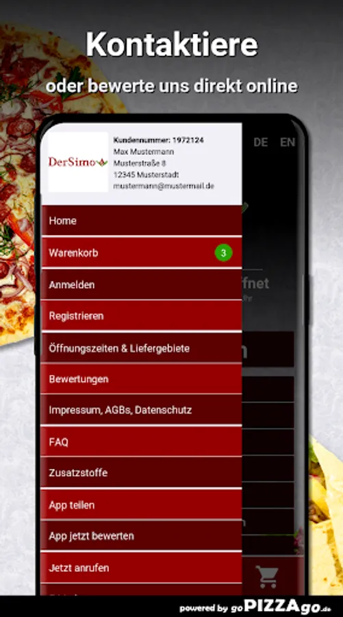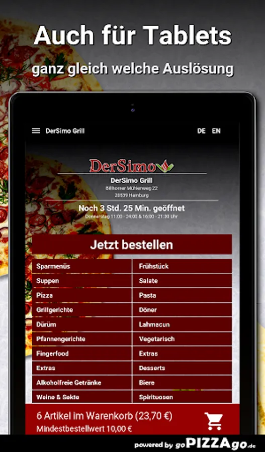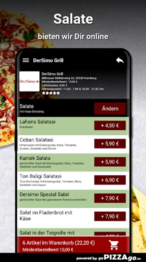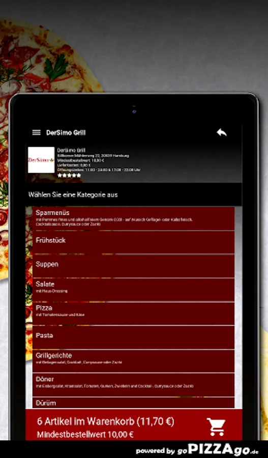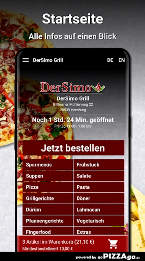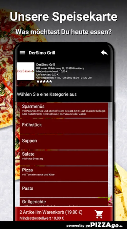 You can order delicacies and food or drinks quickly and easily from our DerSimo Grill pizza service and have them delivered. We offer you more than 245 meals, including curry sauce, Dersimo special pide, lahmacun with doner meat, doner kebab plate with poultry, Dürüm Adana kebab, pizza margherita, Hindi Gögös, 5 Yaprak Sarmasi and lahmacun with doner meat for € 5.50. After feasting, you can enjoy a dessert like baklava, sütlac, 3 baklava. These are our top sellers When can I order from DerSimo Grill?