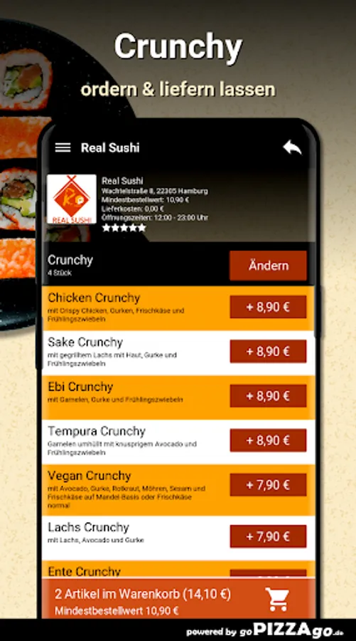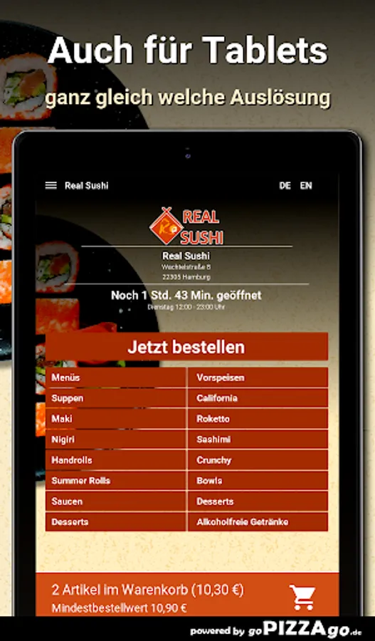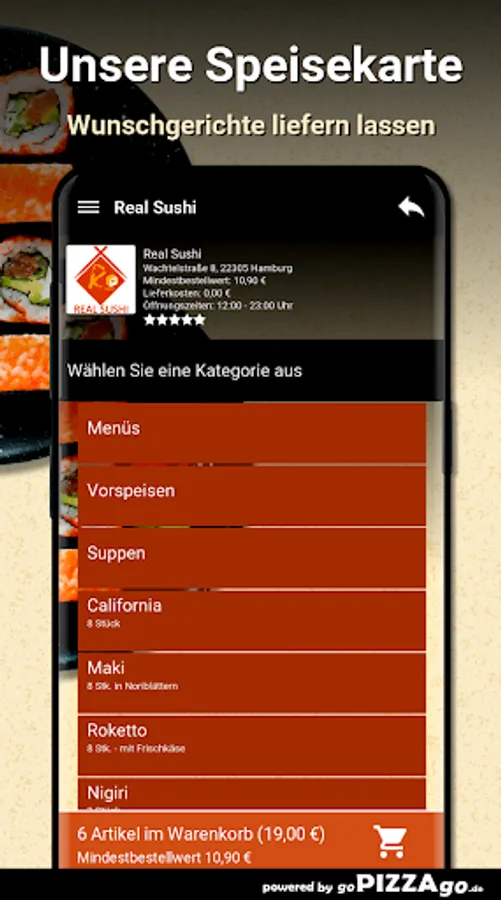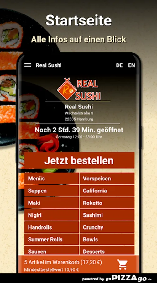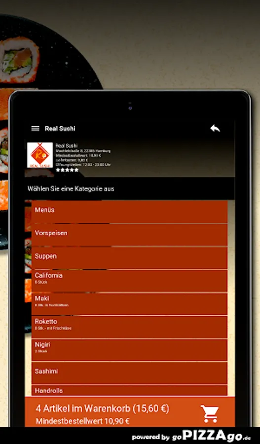 You can order tasty & fresh food quickly and securely online from the Real Sushi delivery service (Wachtelstraße 8 in Hamburg). A variety of 131 dishes such as Salmon Crunchy, Spicy Mayonnaise Sauce, Maki Surimi, Ebi California, Iro California or Surimi Handroll for € 8.90. The popular top-seller Real Sushi is open at the following times